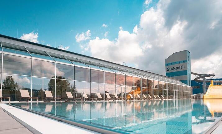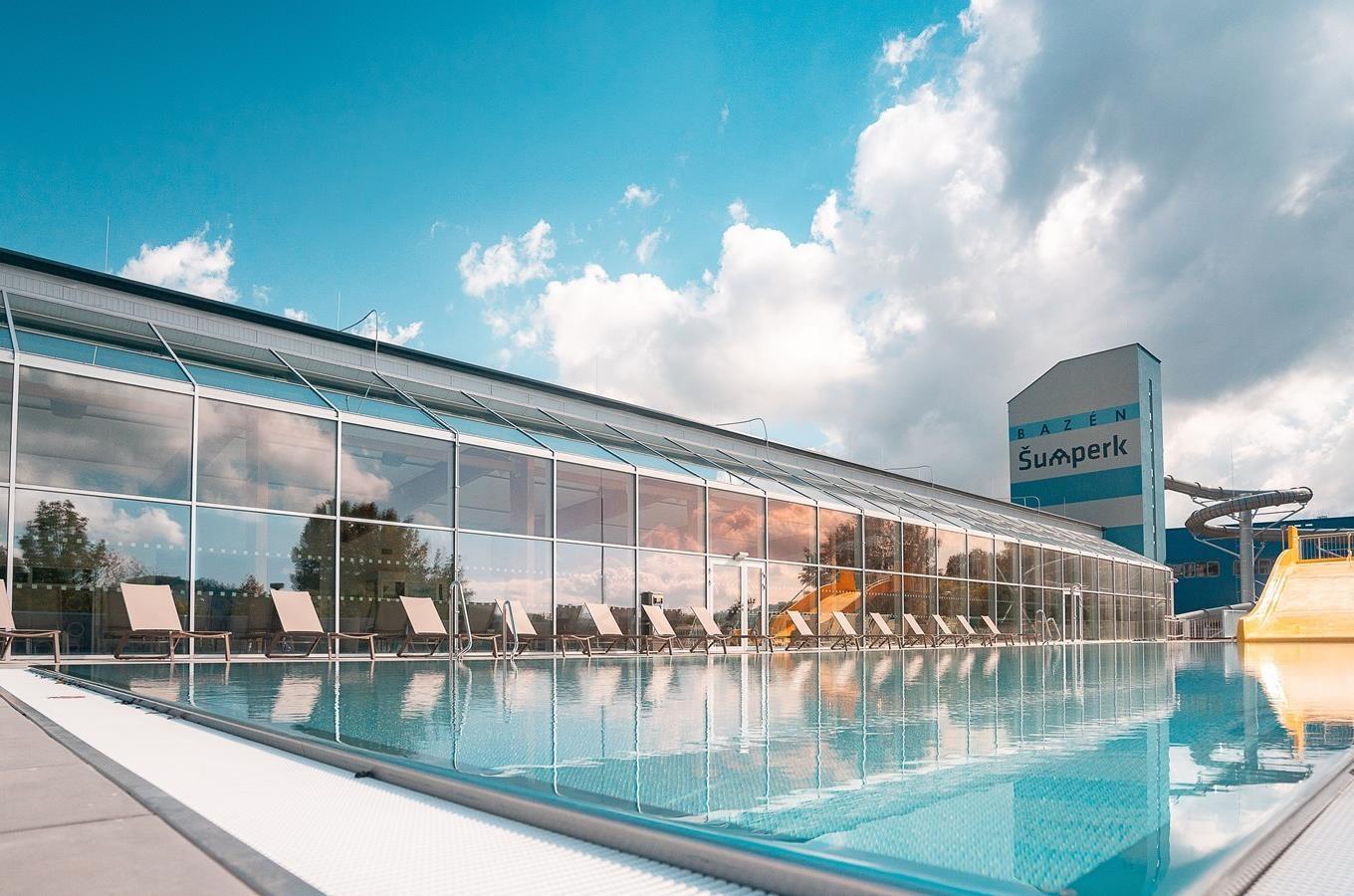 Venkovní bazén o velikosti 25 × 8 m s protiproudem a s travnatou terasou je v provozu pouze sezónně v letních měsících.