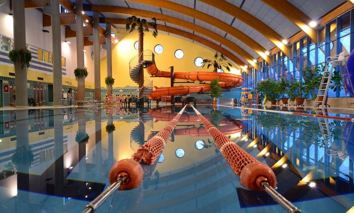 Plavecký bazén má délku 25 m a 5 plaveckých drah. Relaxační bazén je vybaven masážními tryskami, chrličem vody a malým vodopádem.