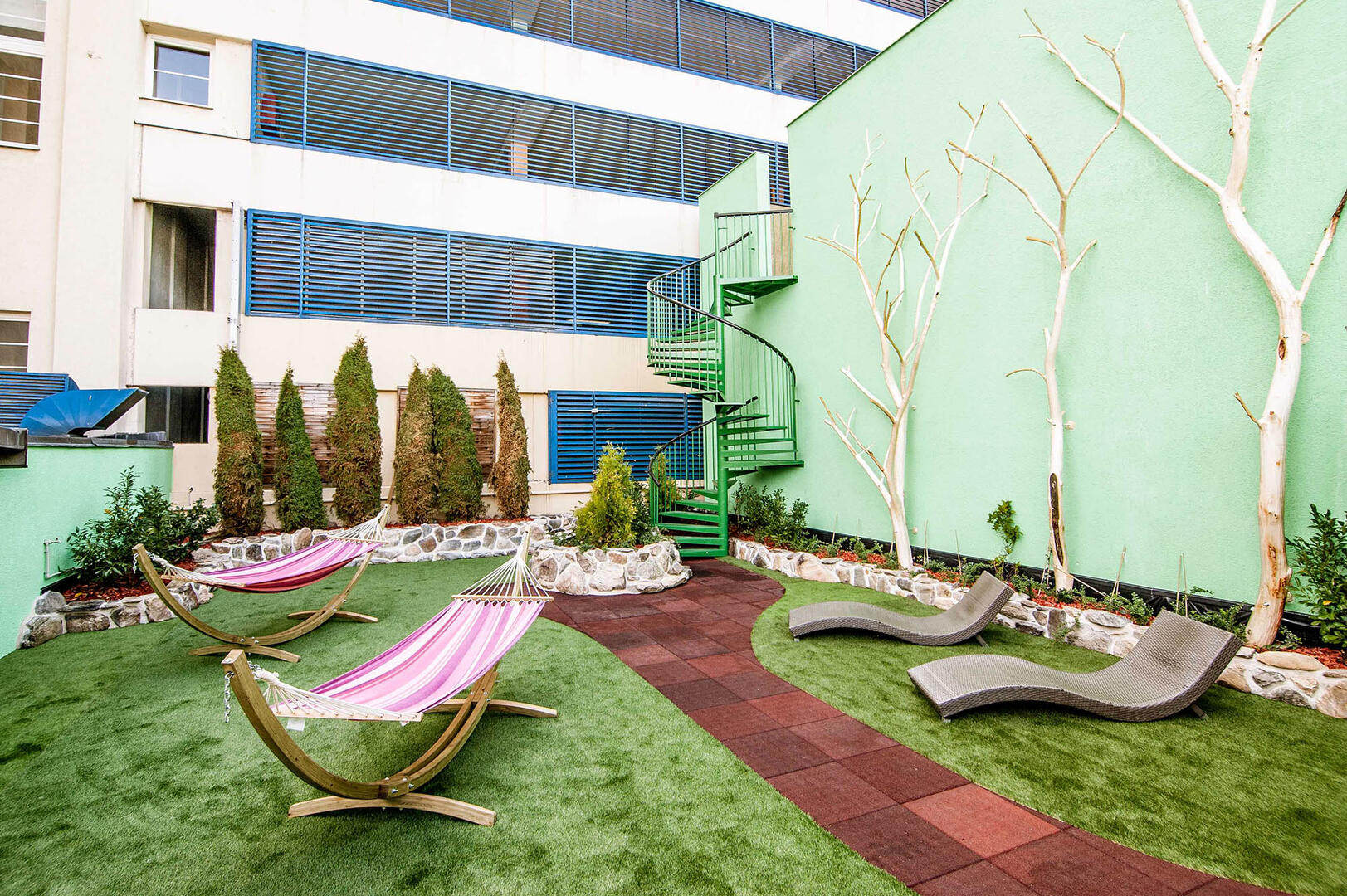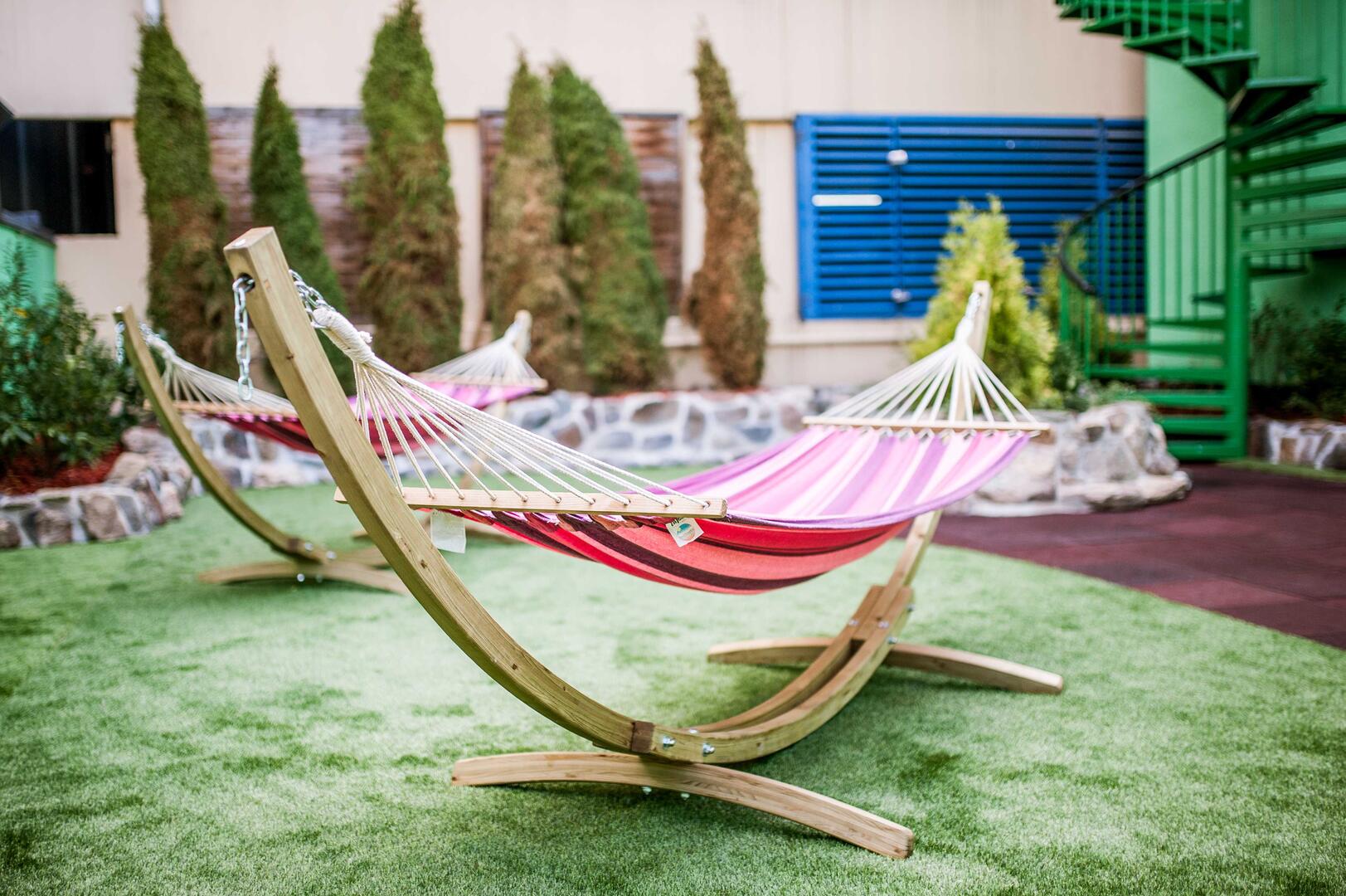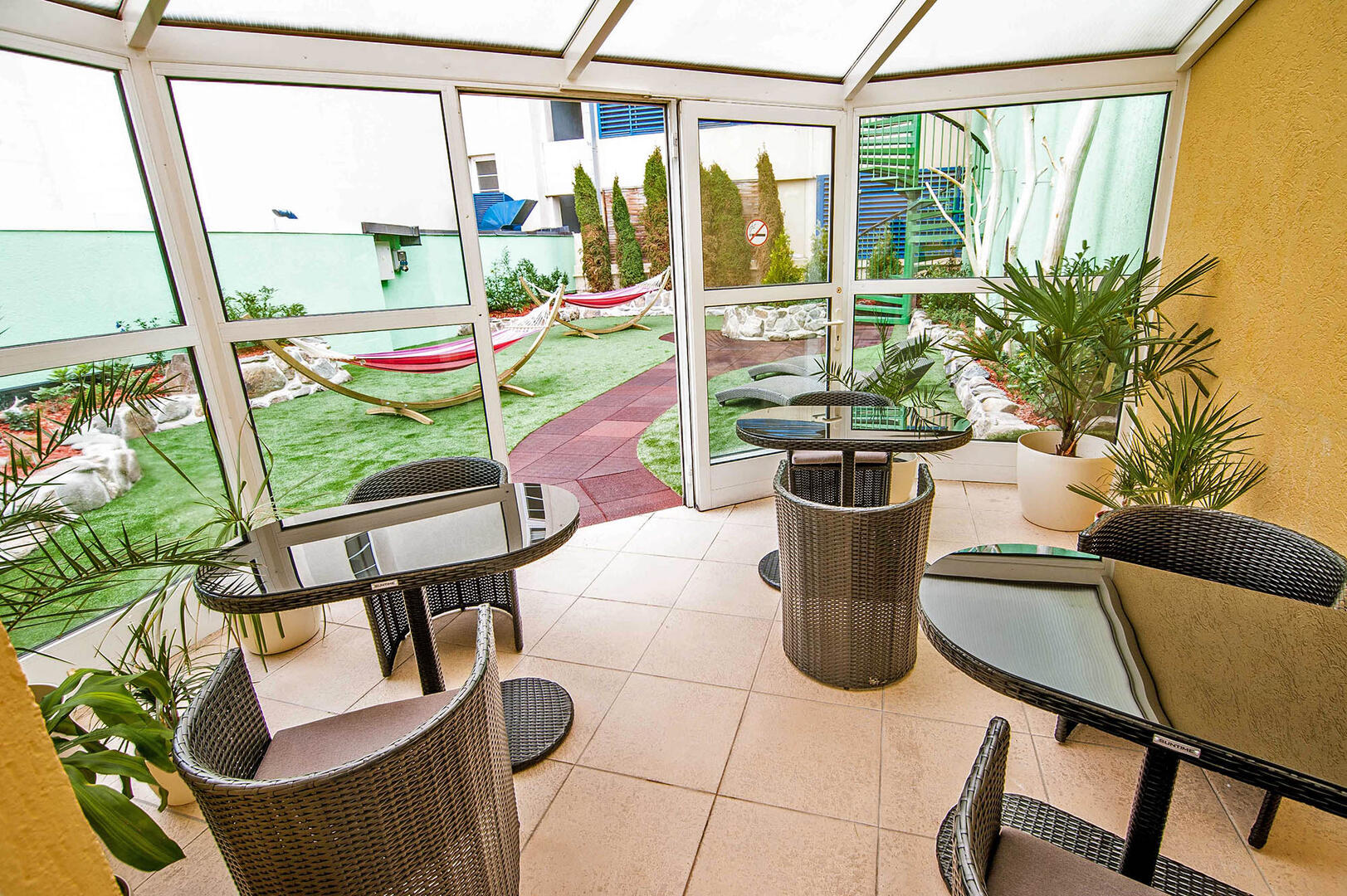 V Aquaparku na vás čeká také venkovní zahrada propojená s vnitřním posezením. K odpočinku a relaxaci jsou k dispozici relaxační lehátka a houpací sítě, které se nachází v příjemném prostředí osázeném venkovními rostlinami, jezírkem či kamennými skalkami.