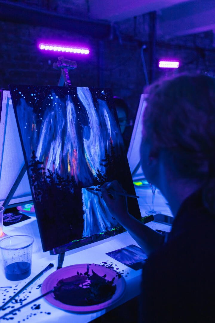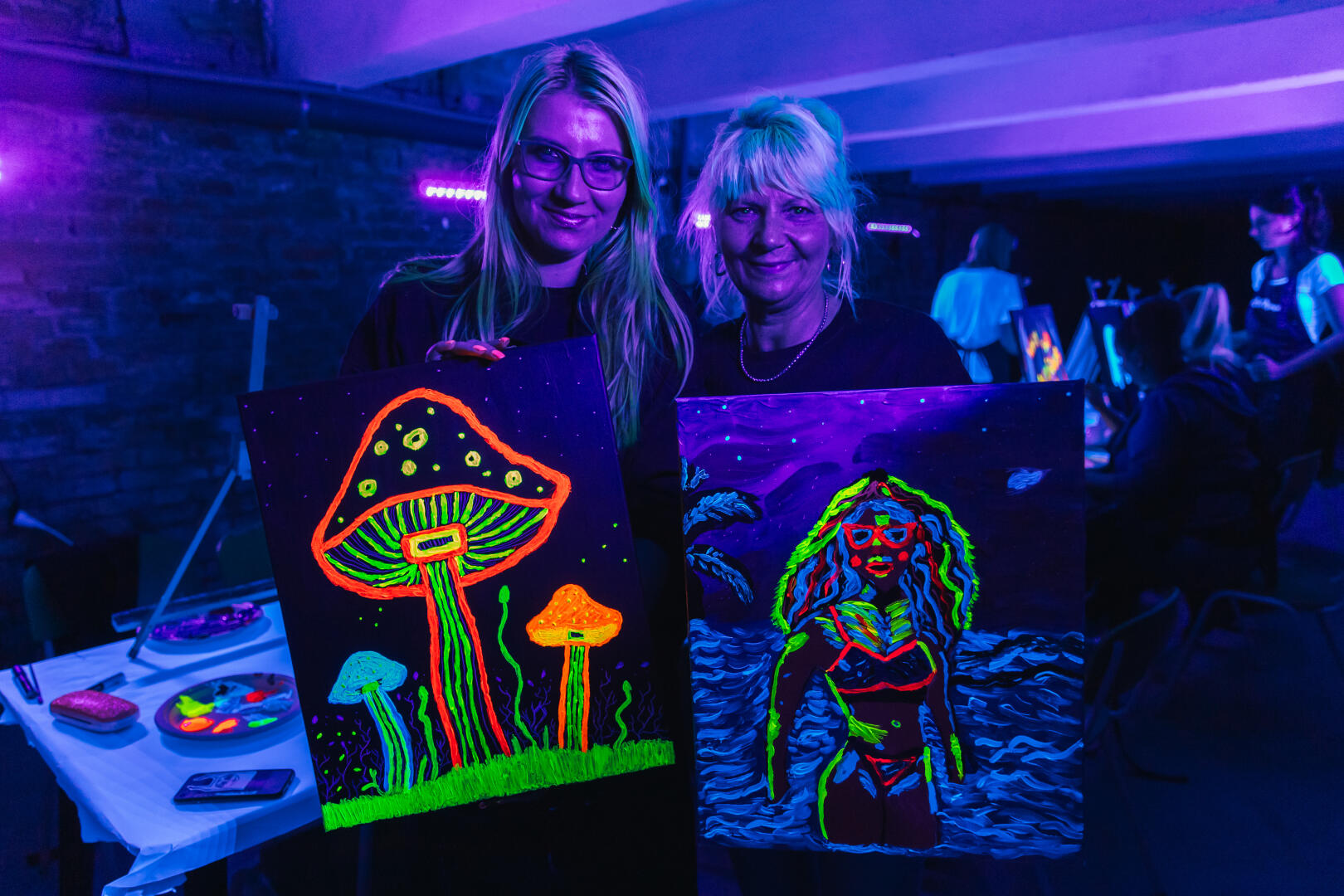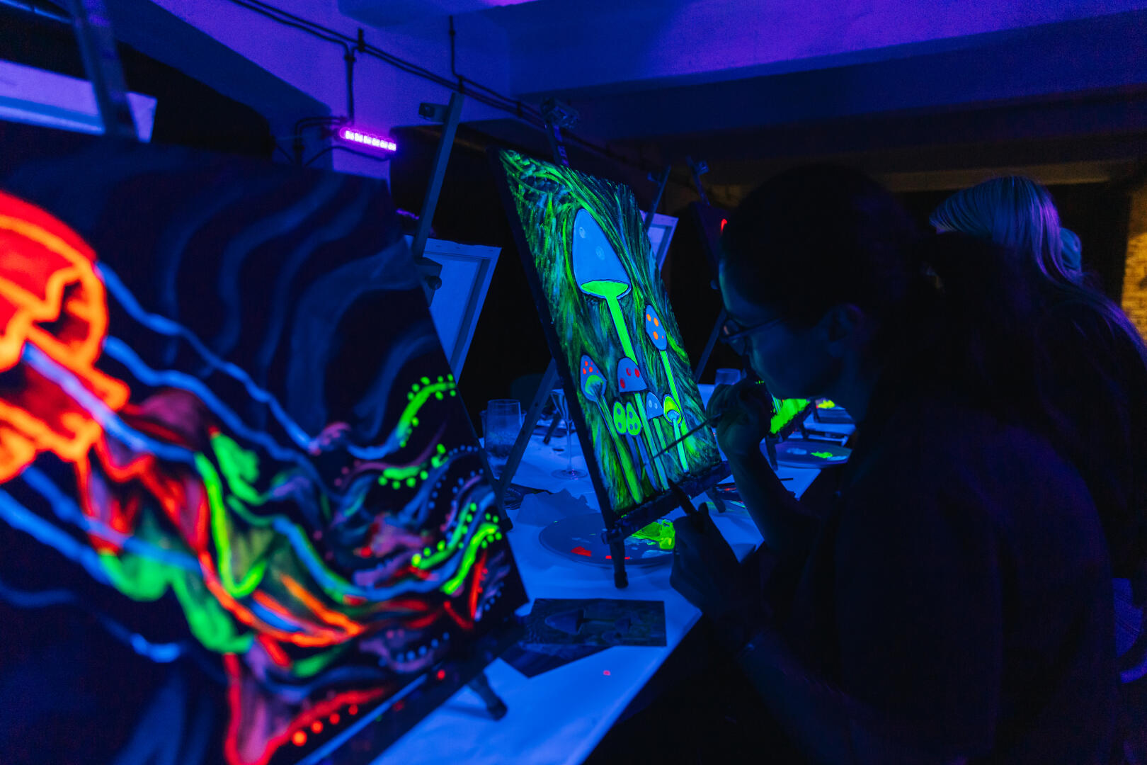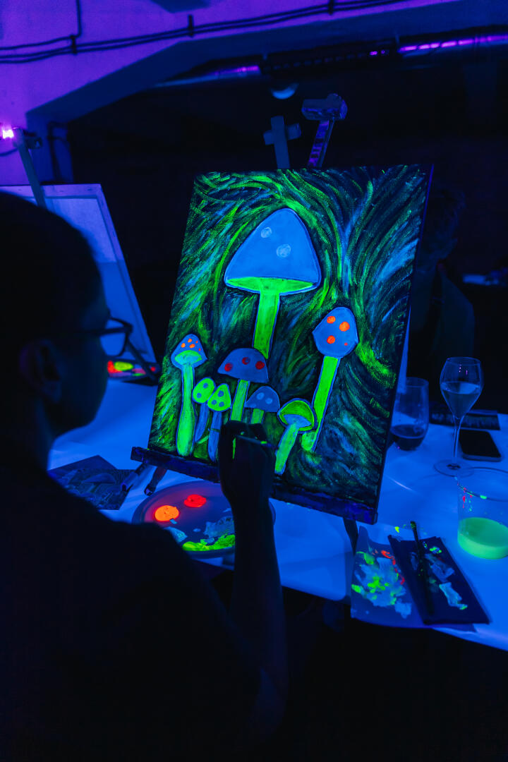 Hned při příchodu vás přivítá welcome drink a podmanivá atmosféra plná černého světla, fluorescenčních tónů a jemného tajemného osvětlení. Na výběr budete mít z více než 50 předloh – od hvězdných krajin po abstraktní či psychedelické motivy. Vyberete si tu, která vás nejvíce osloví, a pustíte se do tvorby.