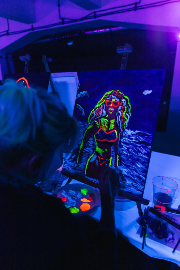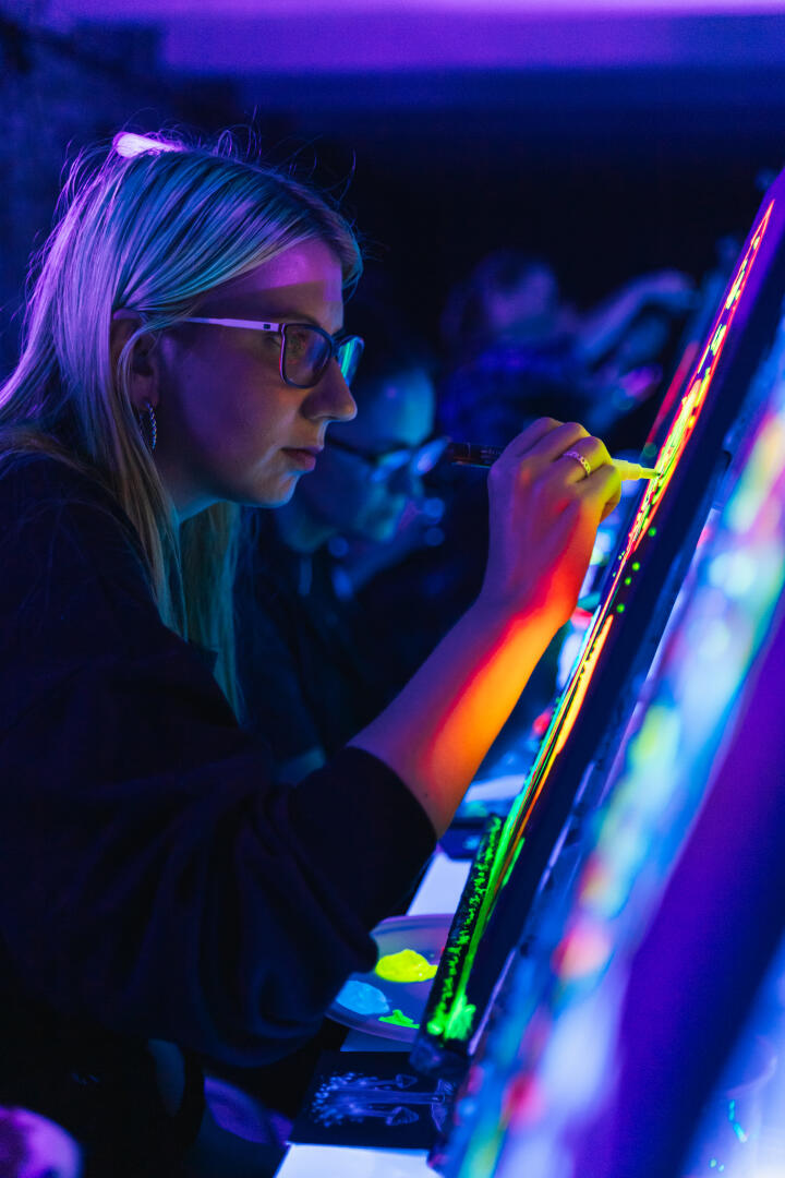 2. Zažijete futuristickou atmosféru – UV světlo a neonové pigmenty promění běžné malování v hypnotizující vizuální show.