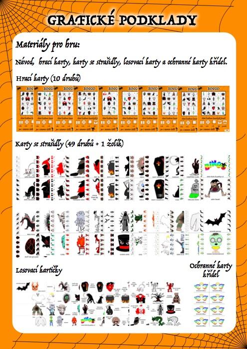 Návod, hrací karty (10 druhů s různým rozmístěním strašidel), karty stanovišť se strašidly (50 druhů), kartičky na losování strašidel, ochranné karty křídel.