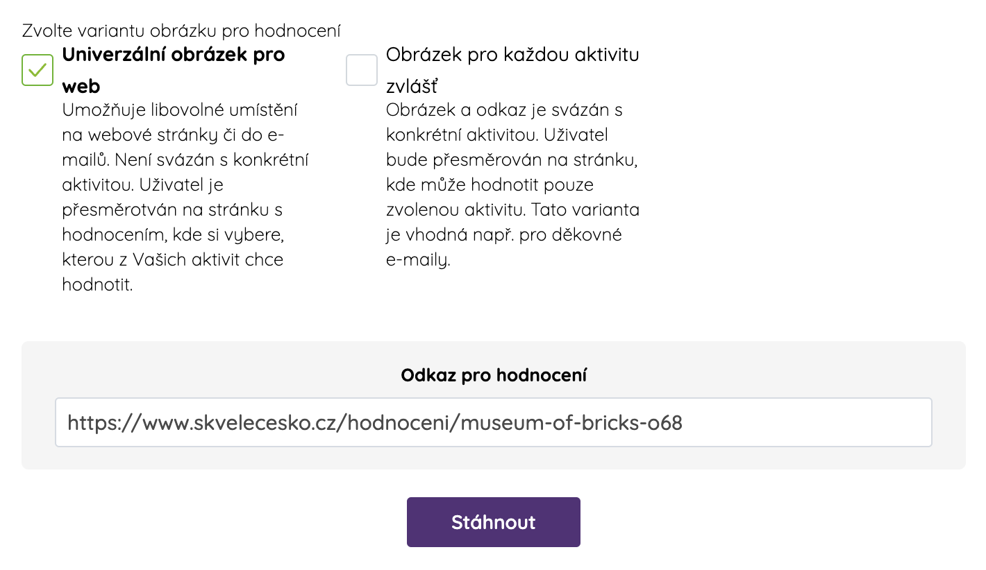 4. Zvolte, na jakou stránku s hodnocením chcete odkazovat. Zkopírujte odkaz pro hodnocení a zvolte "stáhnout".
