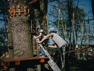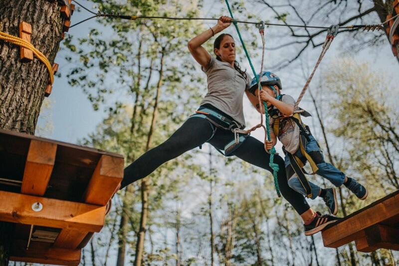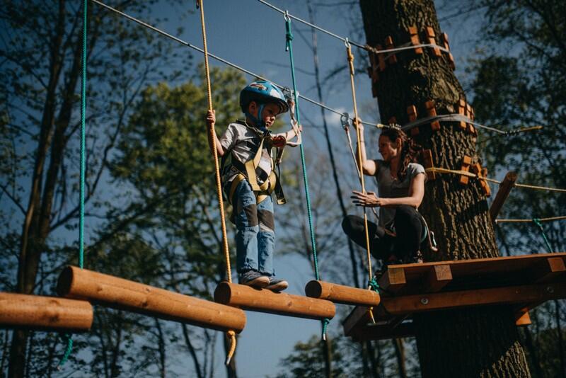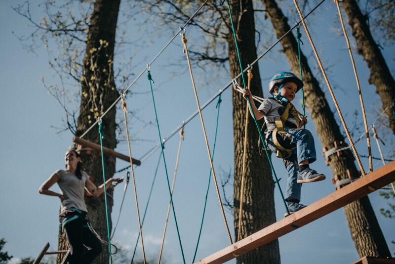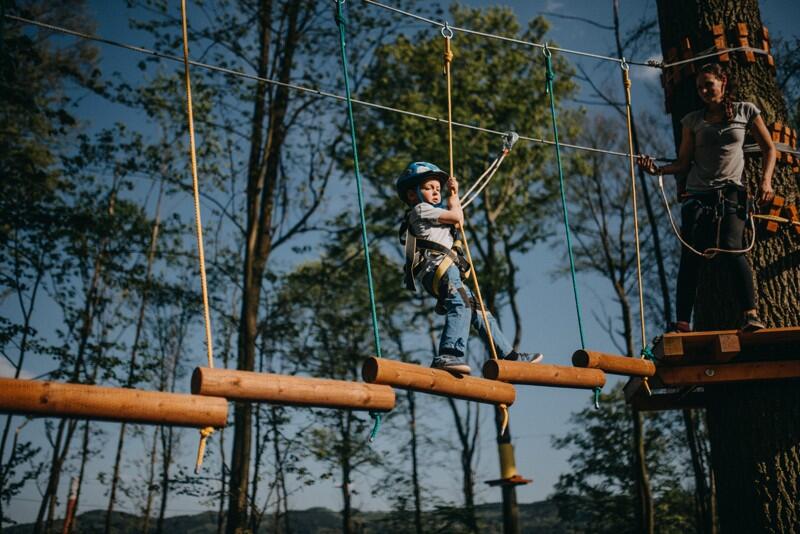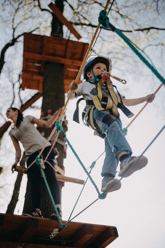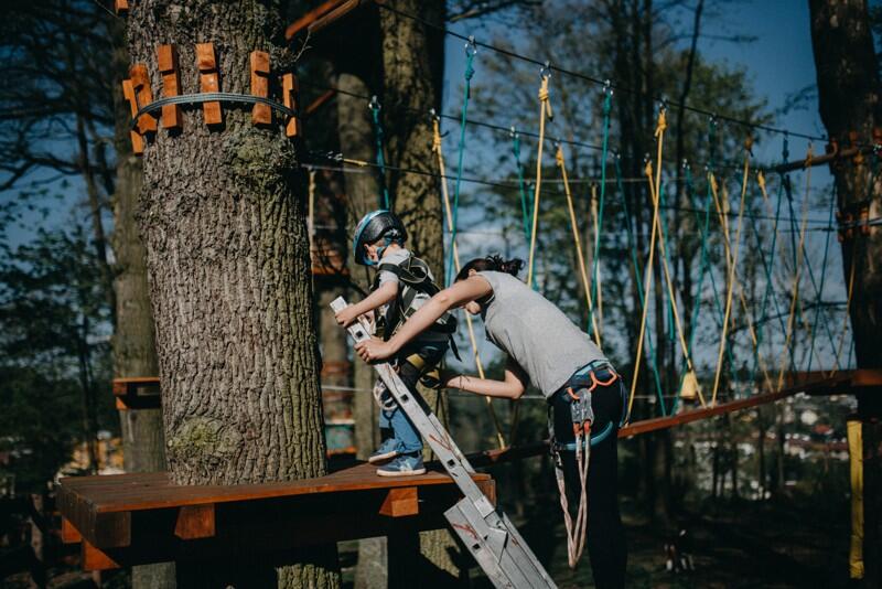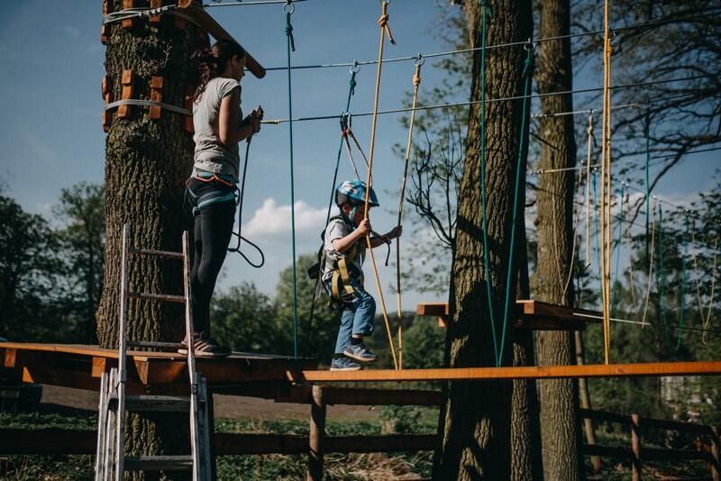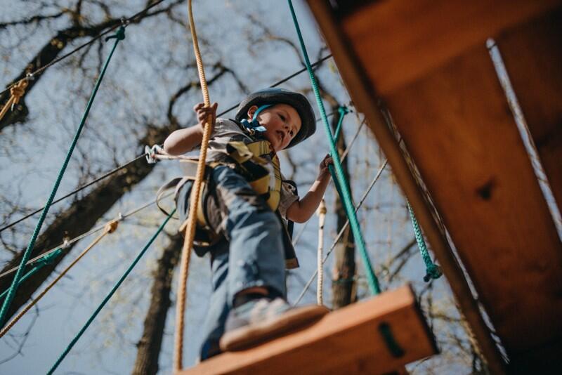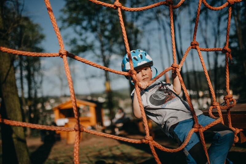 Na dětský okruh je vstup v celotělovém úvazku, ochrannou helmou a jistícími karabinami.