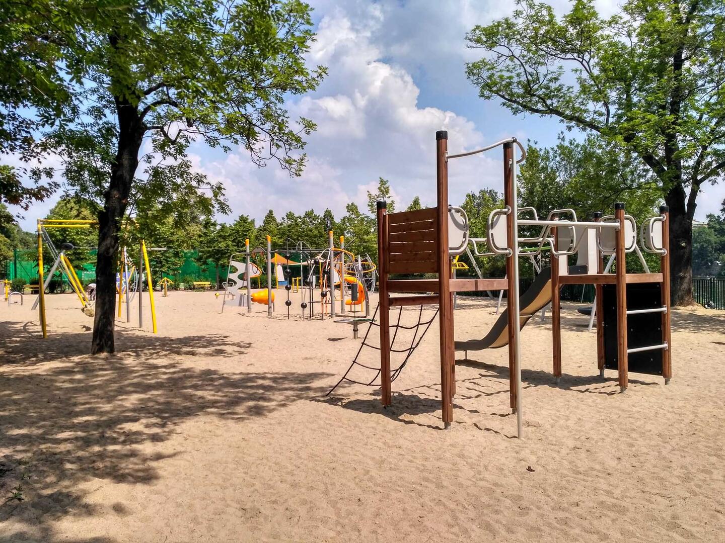 První část tvoří hřiště pro nejmenší s umělým a písčitým povrchem. Dominují tam houpadla a několik menších multifunkčních domků. Povrch je částečně zastíněný. Nejrozlehlejší část je písčitá a nalézá se tu větší počet převážně kovových a plastových multifunkčních prvků, delší lanovka, houpačky aj. Stojí tu rovněž řada cvičebních strojů. Na jedné straně plochy najdeme mlžidlo a na druhé domek s hodinami a tlačítkem pro přivolání policie. Většina povrchu je bohužel nezastíněna.
