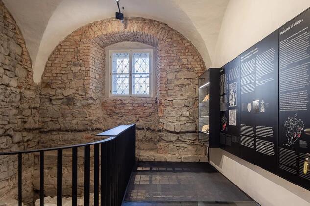 Prohlídková trasa začíná v nejvyšším bodě suterénu, postupně klesá a táhne návštěvníka hlouběji do sklepních prostor, aby na konci vystoupal zpět na zámecké nádvoří. Nově vytvořený labyrint lávek, přechodů a schodišť vhodně doplňuje členité sklepní prostory. Důležitým prvkem je také světlo, které může návštěvník částečně ovládat a nasvítit si tak jednotlivé stavební etapy, a které může také využít při zkoumání modelu hradu. Dozví se také, jak vypadaly a jak fungovaly různé typy padacích mostů.