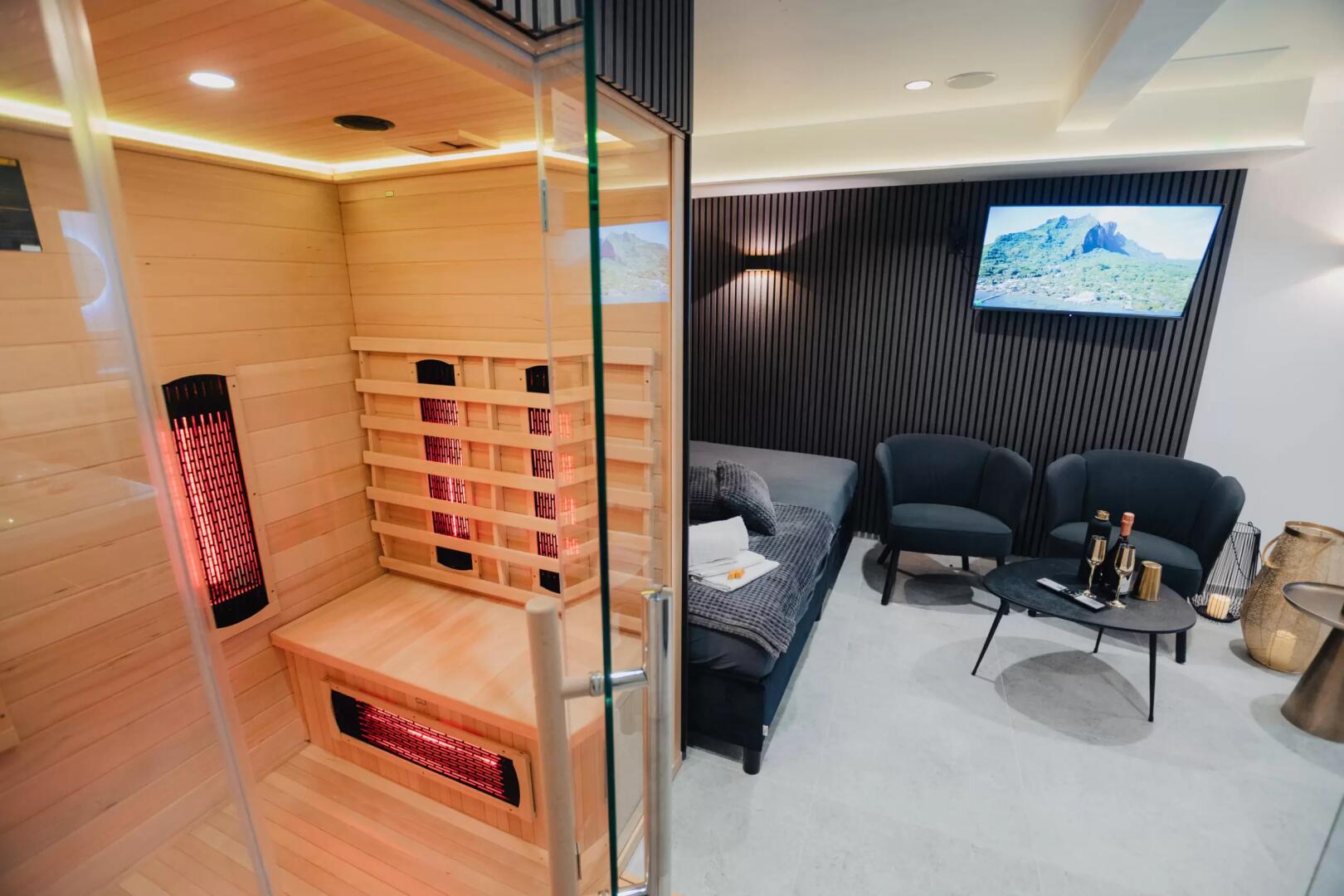Užíjte si naše zcela nové moderní luxusní privátní wellness s kanadskou vířivkou Canadian Spa a infrasaunou. V této klimatizované zóně na Vás bude čekat relaxační zóna s postelí, křesílky a SMART TV s audio systémem a donáškou občerstvení či nápojů z baru přímo do dané zóny. Vždy je dbáno na kvalitní relax v moderním, čistém a klidném prostředí s čistou vodou ve vířivce čištěnou a doplňovanou pro každou rezervaci bez použití chlóru. V ceně máte láhev Prosecca Spumante, ovoce, kávu i čaj a také karafu s vodou, ručníky i prostěradla. O pohodlí a čistotu zde na Vás bude čekat kvalitní kosmetika L'Occitane, fén a další personalizované amenity.