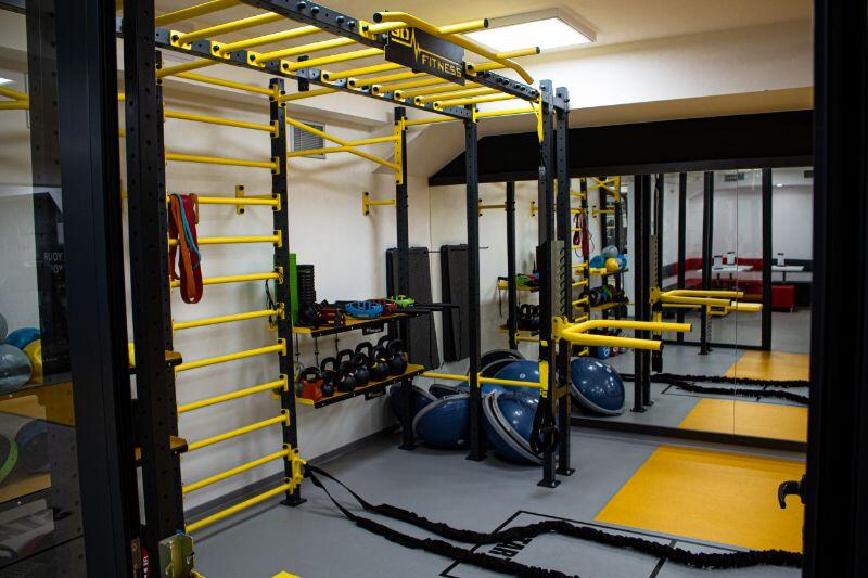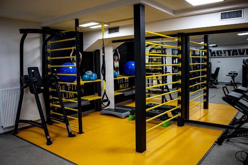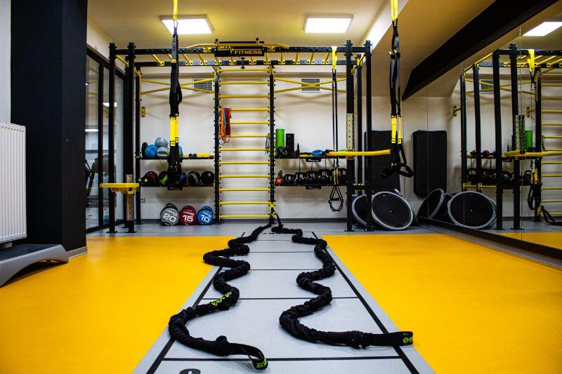 U recepce, slouží k protahování, cvičení s vlastní váhou (TRX), popřípadě pro skupinové lekce.
