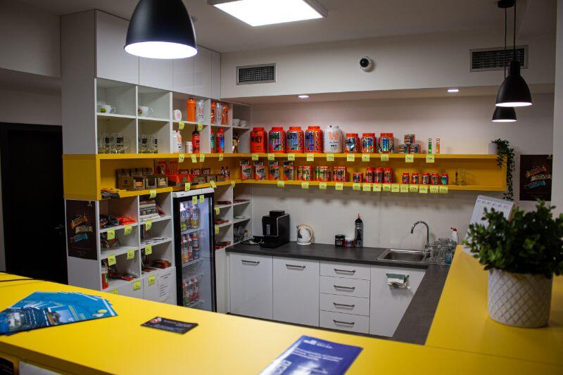 Nachází se před vstupem do sálů posilovny a kromě zaplacení vstupu je zde možno získat osobní kartu návštěvníka na které bude možno předplatit vstupné dle platného ceníku,dobít kredit na placení dalších služeb,občerstvení a přípravků.