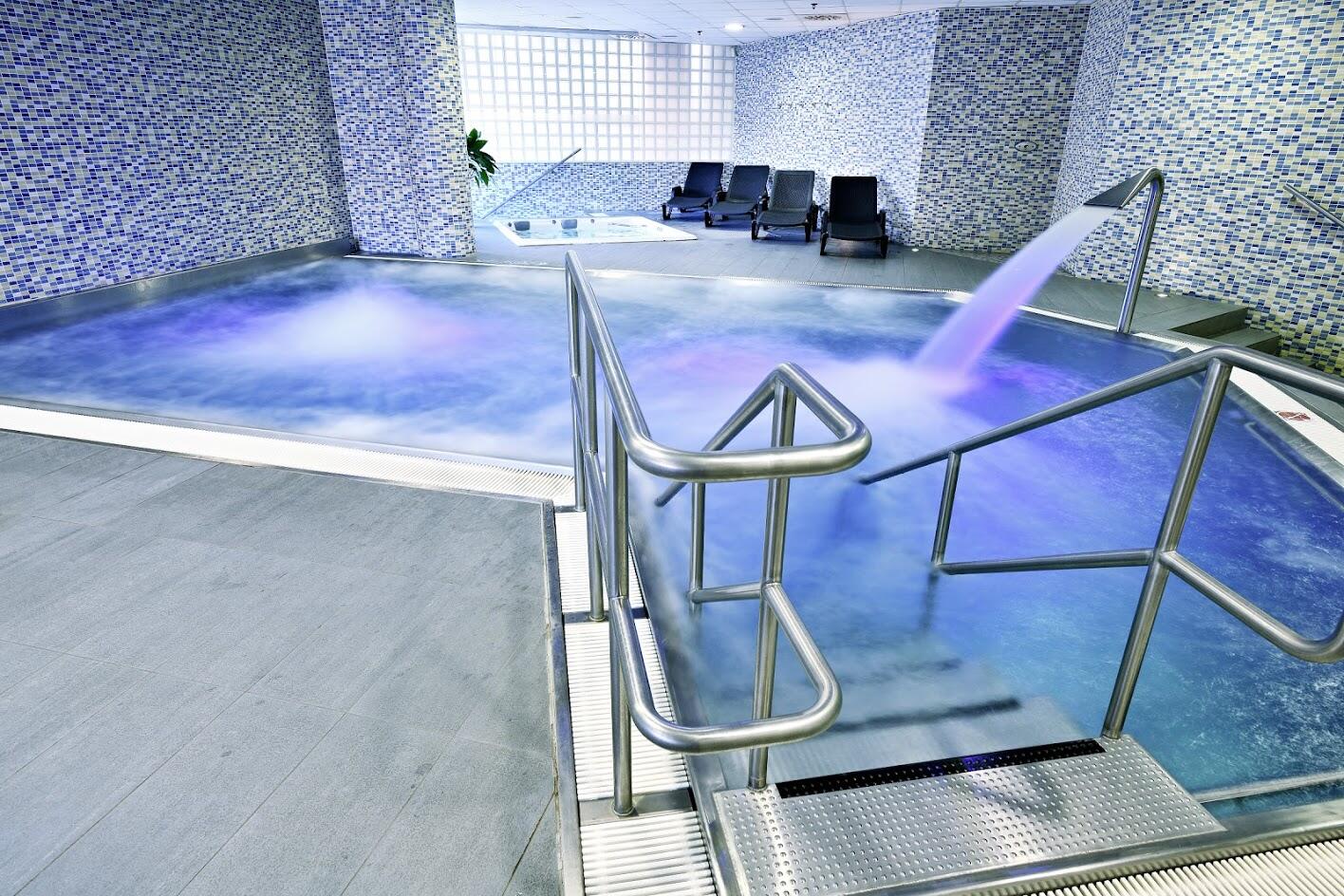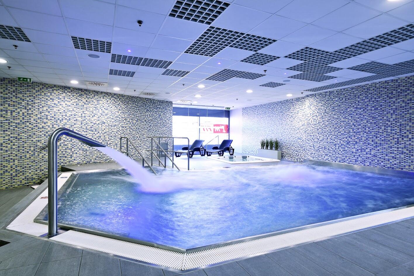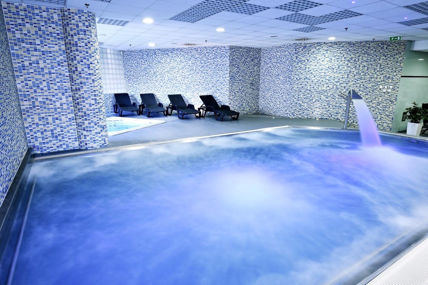 Příjemný relax v bazénu s protiproudem, gejzírem a vodopádem. Teplota vody je 28 stupňů. Vhodný pro zklidnění a uvolnění.