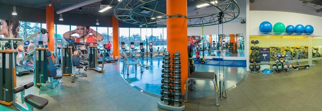 Komplexně vybavený prostor s volnými váhami, posilovacími stroji a plyometrickými cvičebními stanicemi.