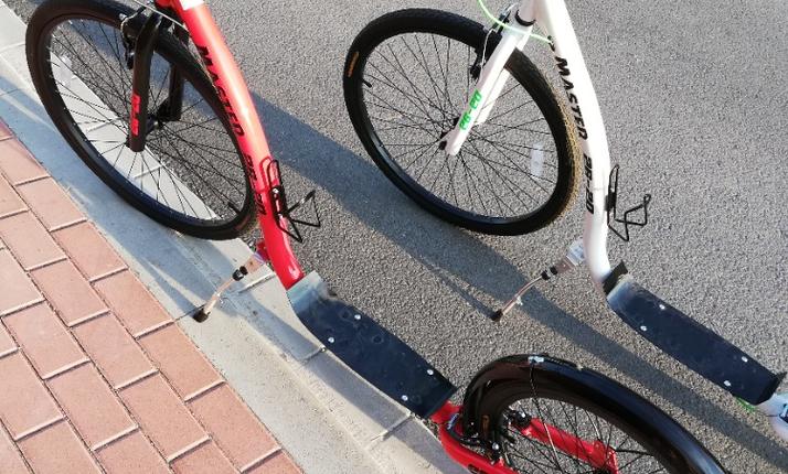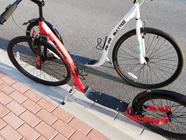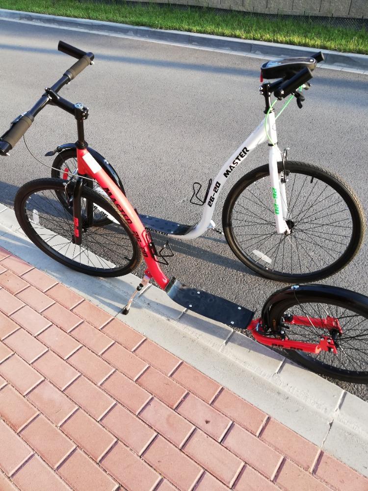 Koloběžky s nosností 120 kg, s nastavitelnou výškou řidítek a rohy pro pohodlnější jízdu, přední kolo 26″, zadní kolo 20″, držák na láhev, taštička na mobil na řídítkách, blikačky, blatník, stojánek,v ceně půjčovného je helma.
