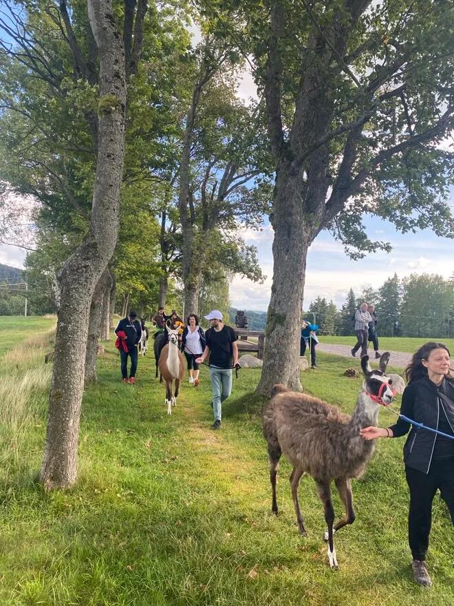 Po krátkém seznámení s bezpečnostními pravidly dostanou lamy své postroje a vyrazíte na 1,5 km dlouhou procházku. Čeká vás pohodová vycházka, během které si lamy pohladíte, vyfotíte se s nimi a dozvíte se zajímavosti o jejich životě, chovu i původu.