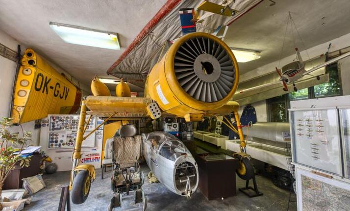 letecké motory a přístroje, pilotní výzbroj a výstroj, modely, bohatá fotogalerie, letouny Z-37 Čmelák, L-13 Blaník a vrtulník Mi-2, maketa přední části trupu Mosquito De Havilland Fb IV, zmenšený 60 procentní model letounu z I.sv.v. Ansaldo SVA 5.