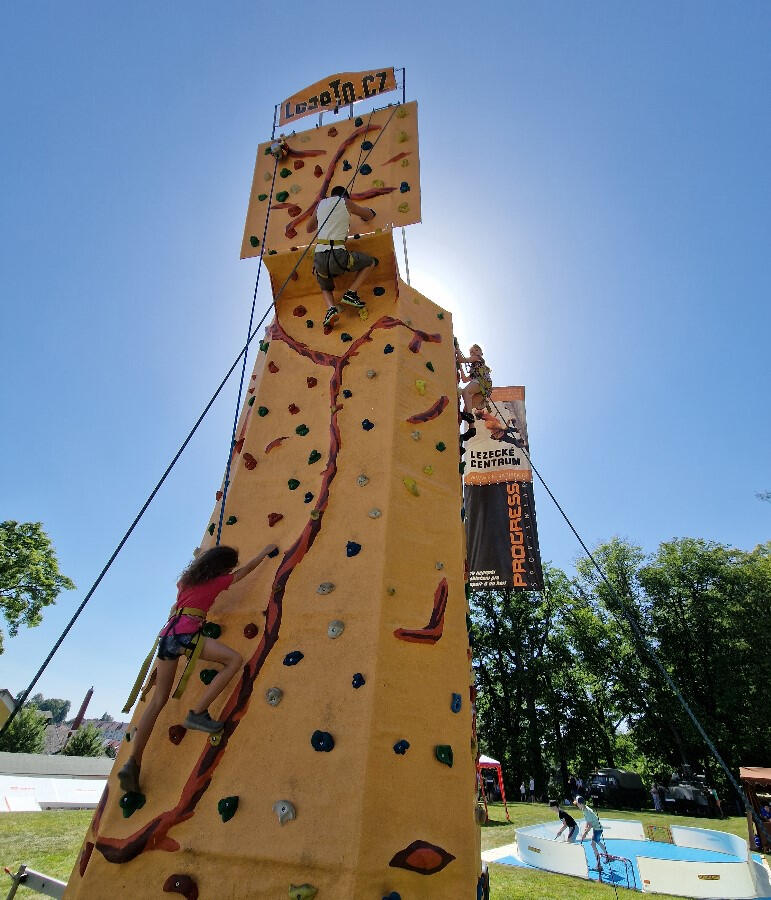 Boulderingová stěna - Titanic - Největší mobilní boulderingová stěna v ČR. Moderní desing, 70 m2 lezecké plochy, výška 3,8 m. Stěna je ohraničená dopadovými žíněnkami a sestup je zajištěn 6 m dlouhou skluzavkou. Leze se bez lana, vrchol stěny je ohrazen zábradlím s šesti kruhovými průlezy pro děti. Na vrchol stěny vedou výstupové varianty pro děti od 3 let . Zadní část je určená pro zkušené lezce i dospelý.