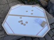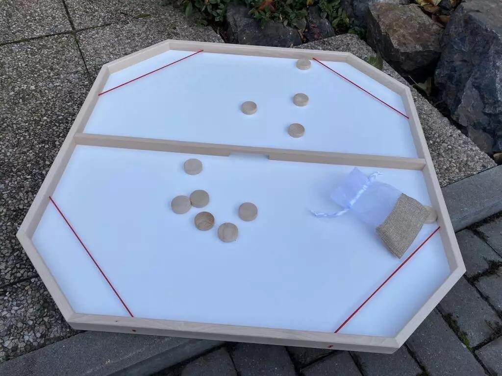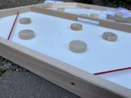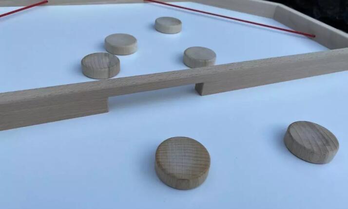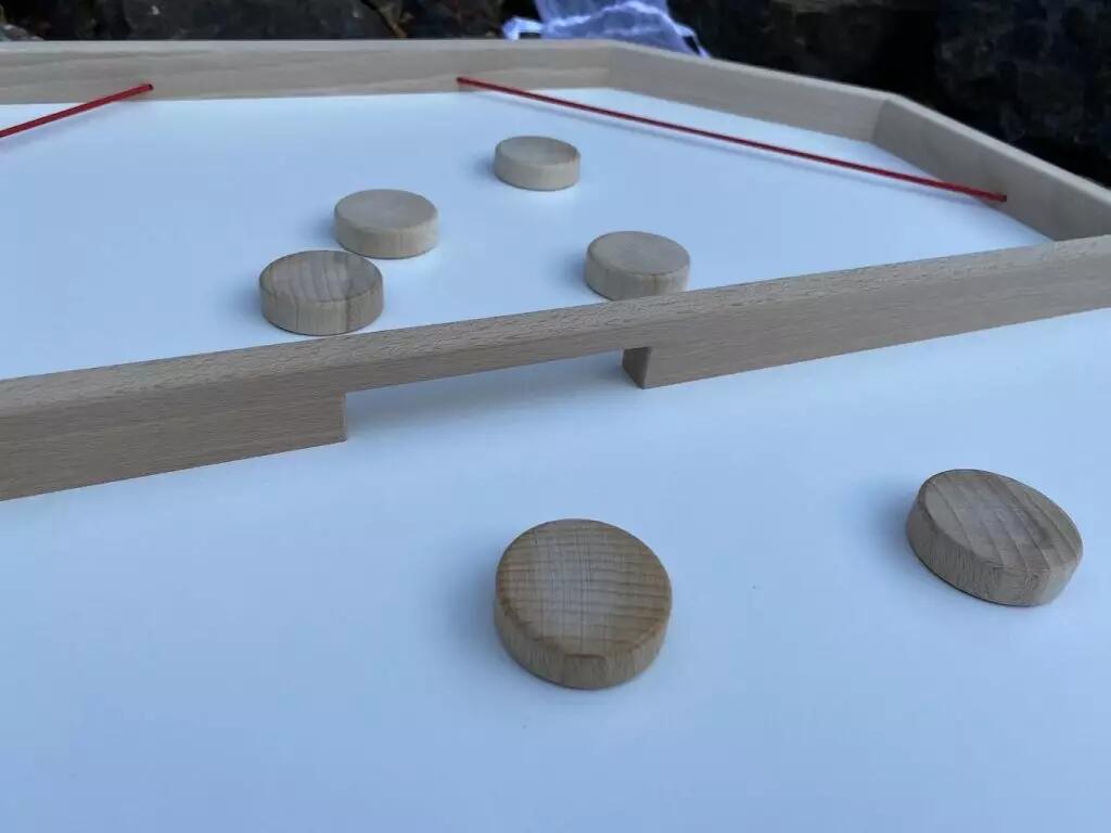 Na hrací desce o rozměrech 80 x 80 cm, která má po okrajích rám a uprostřed branku, soupeří čtyři hráči rozdělení do dvou týmů.