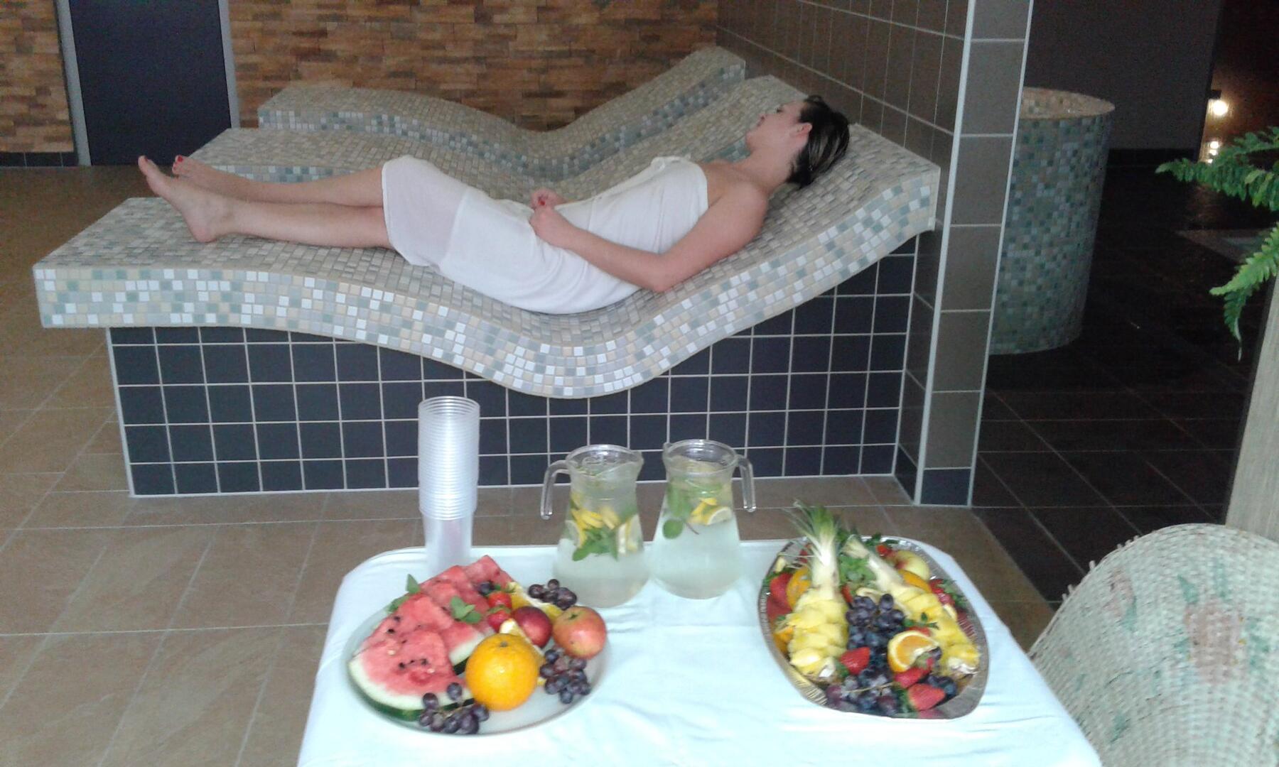 Ve wellnessové části našeho areálu se nacházejí oddělené samostatné šatny, WC a sprchy s celkovou kapacitou 40 osob. V celém prostoru je několik polohovacích lehátek, ratanová lehátka a 3 lehátka vyhřívaná.