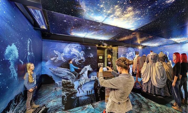 Výstava je koncipována jako filmové scény a malé ateliéry, kterými budete procházet a můžete se v nich – přímo mezi kulisami – natáčet v akci. Vznesete se na létajícím stroji, osedláte okřídlené koně, proletíte se na dělové kouli jako baron Prášil, vyzkoušíte si stop-motion animaci nebo budete ovládat známou ponorku z Vynálezu zkázy.
