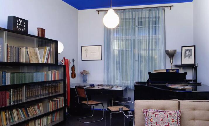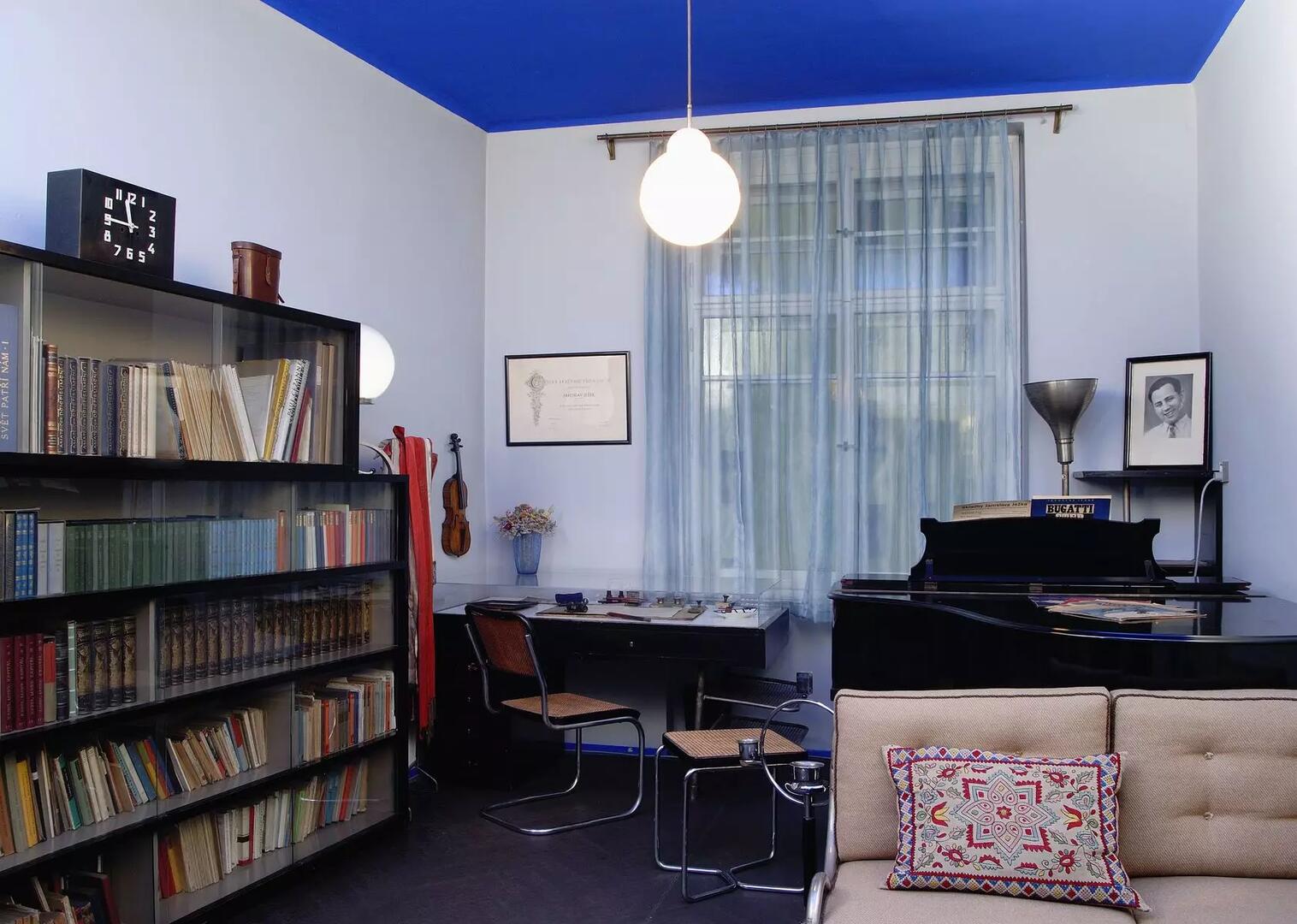 Zařízení interiéru Modrého pokoje na přání skladatele navrhl jeho přítel, architekt František Zelenka, který byl též autorem scénických návrhů pro Osvobozené divadlo. Pokoj zůstal vybaven tak, jak jej Ježek opustil. Pod oknem je černé křídlo Steinway s notovými materiály, na pracovním stole kalamář, brýle, těžítka, piják, dýmka a popelník, kapesní hodinky, tužka a notový papír. Je zde i zajímavá a bohatá knihovna se spisy Jiřího Wolkera, Jana Nerudy, mnoha díly české a světové beletrie, knihy o výtvarném umění, slovníky, mnoho knih o hudbně, hudebniny aj. Nechybějí ani původní kachlová kamna, pohovka, modré záclony a skřínka na gramodesky. Jsou zde partitury s osobním věnováním skladatele Igora Stravinského a Daria Milhauda.