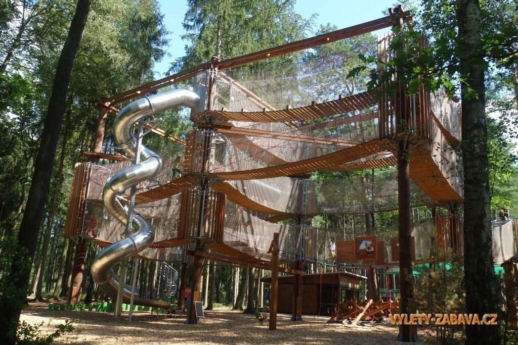 Park Na větvi tvoří unikátní soustava tří síťových hřišť zavěšených v korunách stromů propojených s 3D bludištěm, které je složeno ze síťových překážkových drah rozprostřených ve třech patrech nad sebou. Síťové bludiště v korunách stromů obsahuje mnoho zábavných prvků, které otestují vaše motorické dovednosti. Jednotlivé herní plochy jsou propojeny visutými lávkami. Celá atrakce vrcholí sjezdem unikátním tobogánem z výšky necelých 10 m. Pohybová atrakce je natolik bezpečná, že na rozdíl od klasických lanových center nevyžaduje žádné osobní lanové jištění.