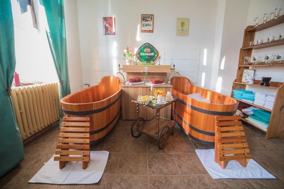 Lázně pro 2 osoby v 1 vaně s masáží trvají 1,5 hodiny: v této době můžete konzumovat bohaté občerstvení a popíjet neomezeně vychlazené pivo značky Bernard. První půl hodiny odpočíváte v teplé lázni, po této době vás navštíví masérka a provede první osobě 20 minutovou masáž celých zad a šíje, pak se osoby vymění . Po ukončení masáží můžete ještě relaxovat na pohodlných sedačkách.