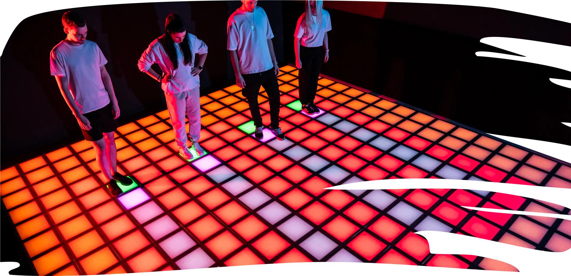 Na ploše o velikosti 25 m² tě čeká interaktivní svět plný barev, světel a výzev. Dynamické audio, měnící se herní prostředí a živé efekty vytvářejí atmosféru, která tě okamžitě vtáhne do děje. S každým krokem reagují dlaždice na tvůj pohyb, svítí, blikají a posouvají tě ve hře dál. Připrav se na napětí, akci a soutěživého ducha!