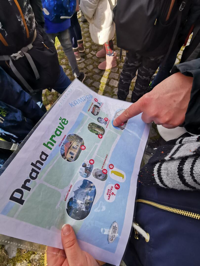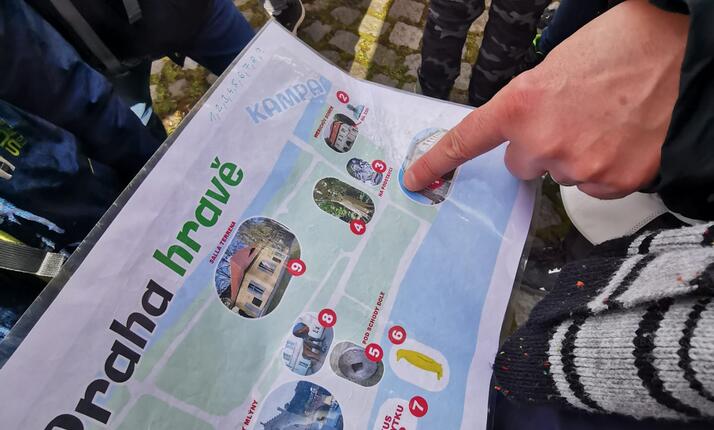 První soutěžní a poznávací část společná na Karlově mostě, druhá část v terénu s mapičkami na Kampě.