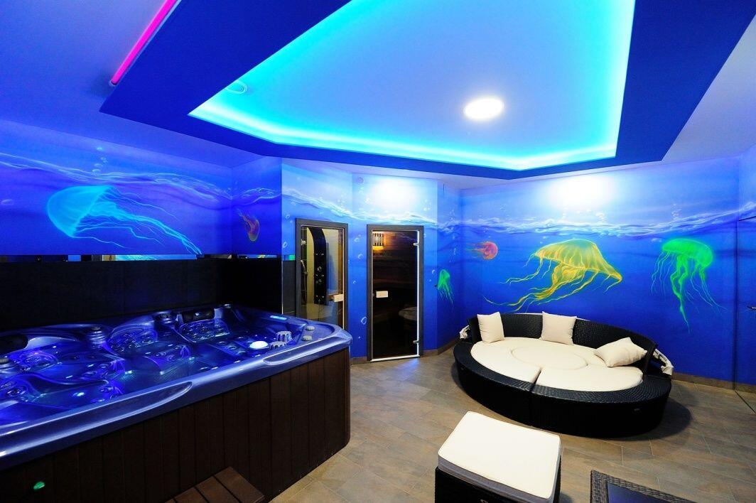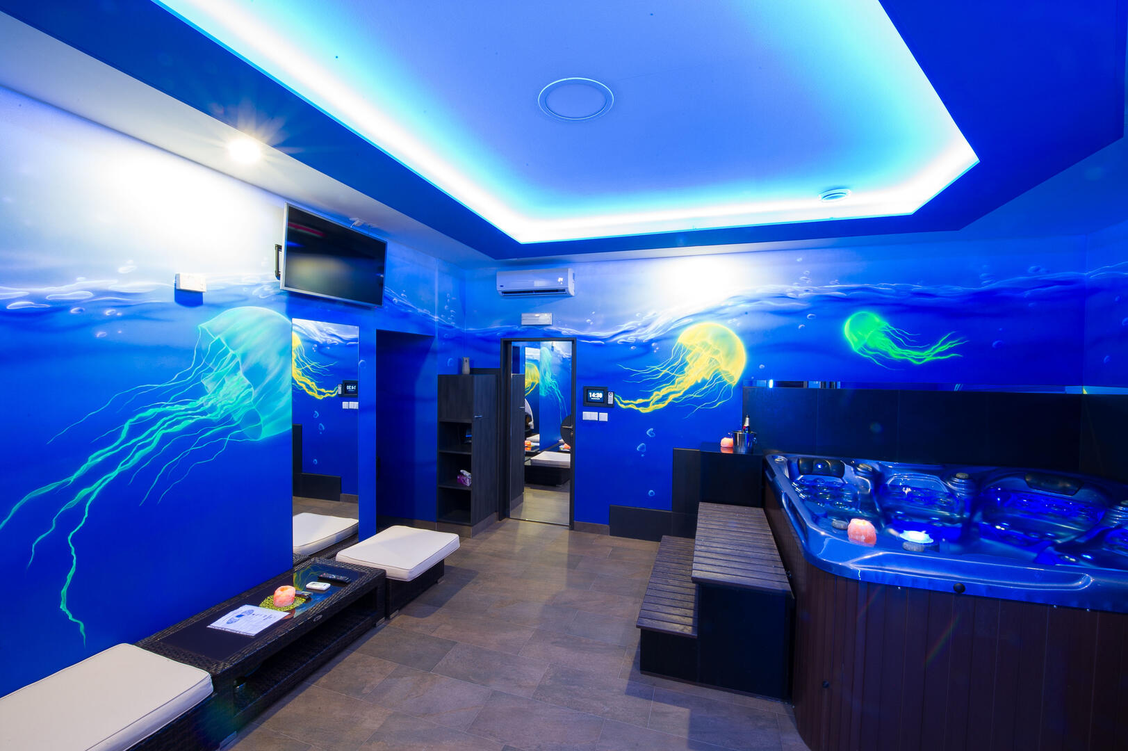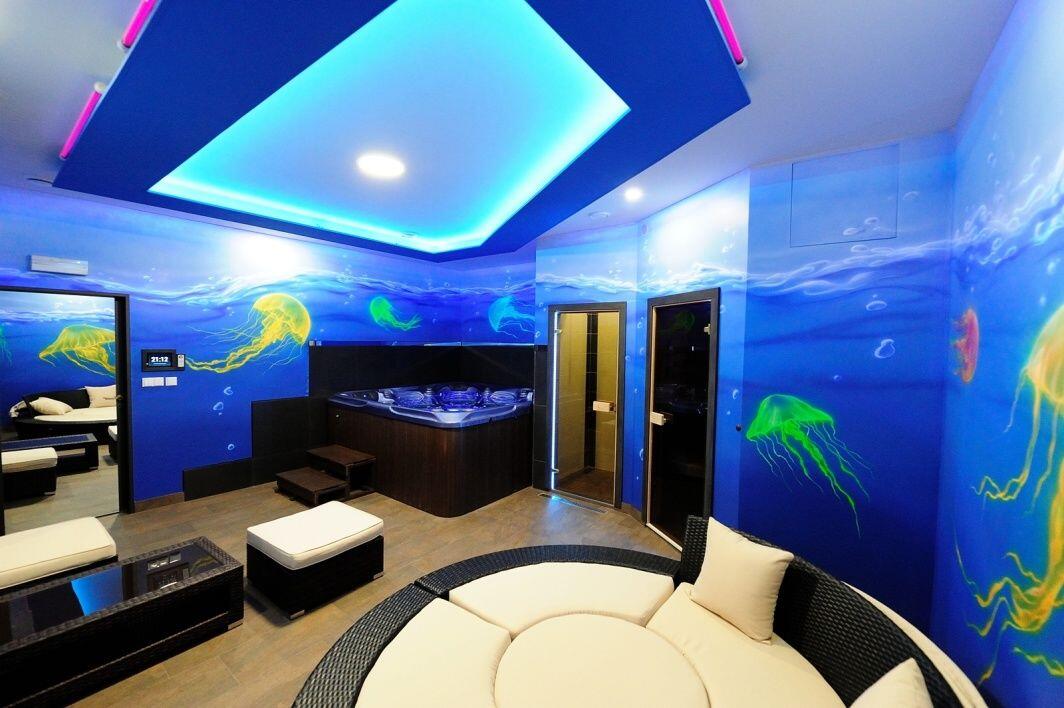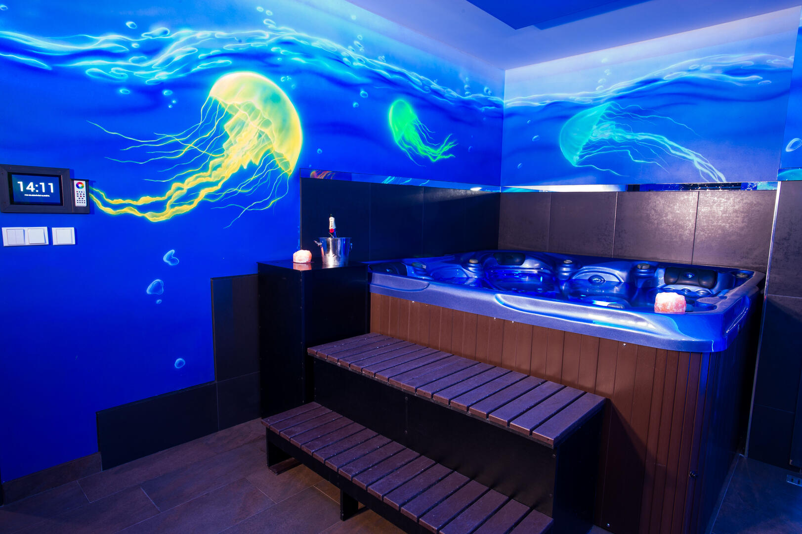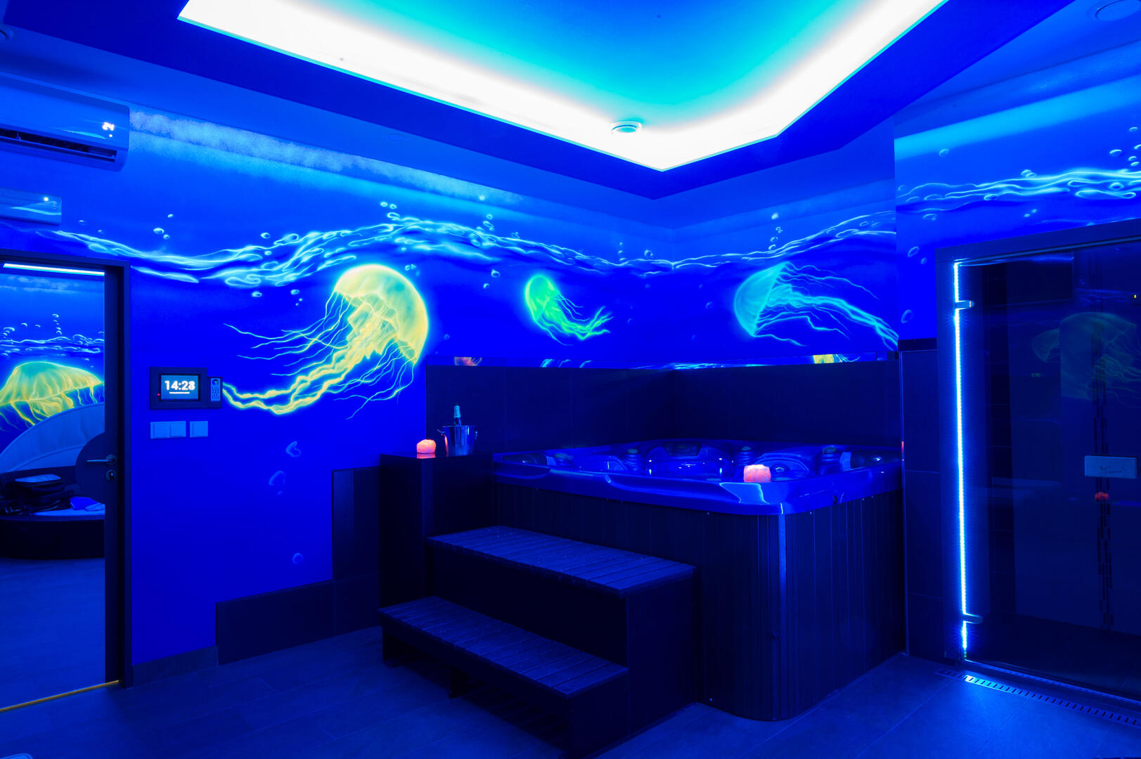 Privátní zóna je situován jako podmořský svět, naší snahou bylo navodit velice příjemnou a uklidňující relaxační atmosféru v privátní vířivce a sauně. Tematická malba celé zóny, je v provedení 3D, podsvícená UV světlem a zaručuje nevšední zážitek.