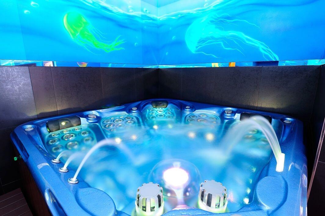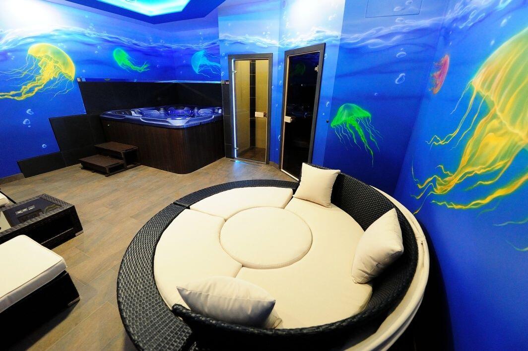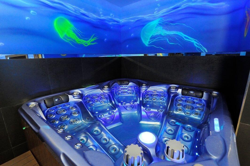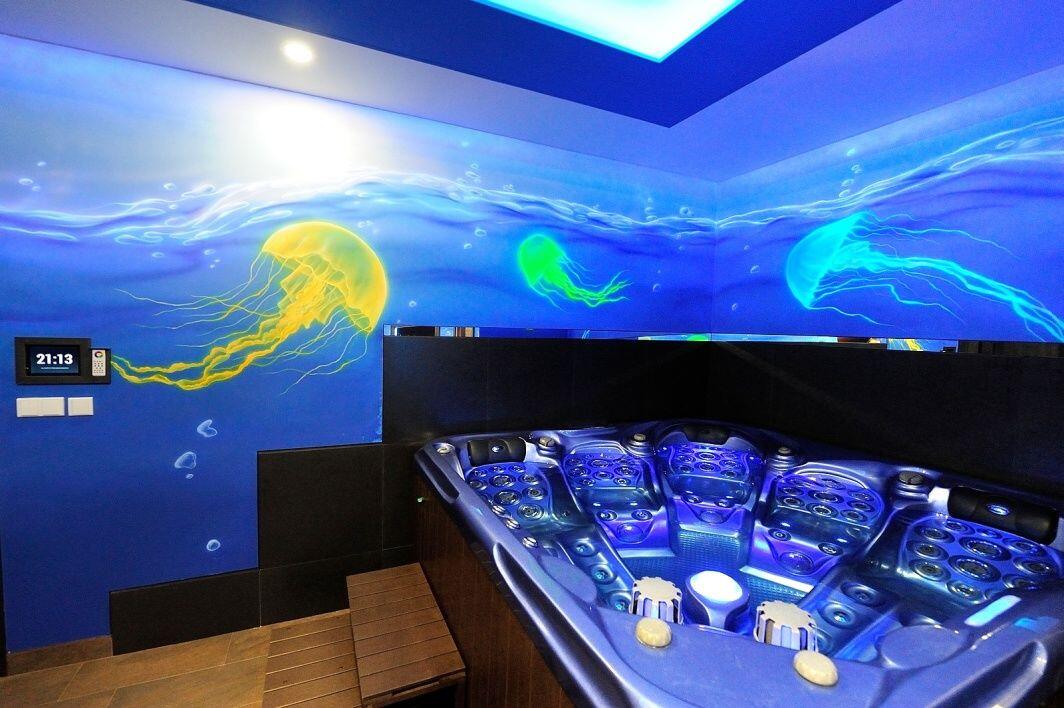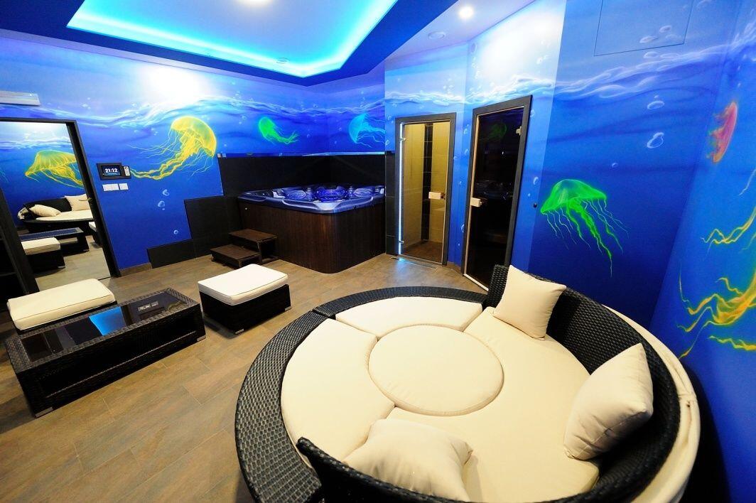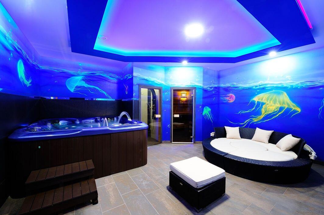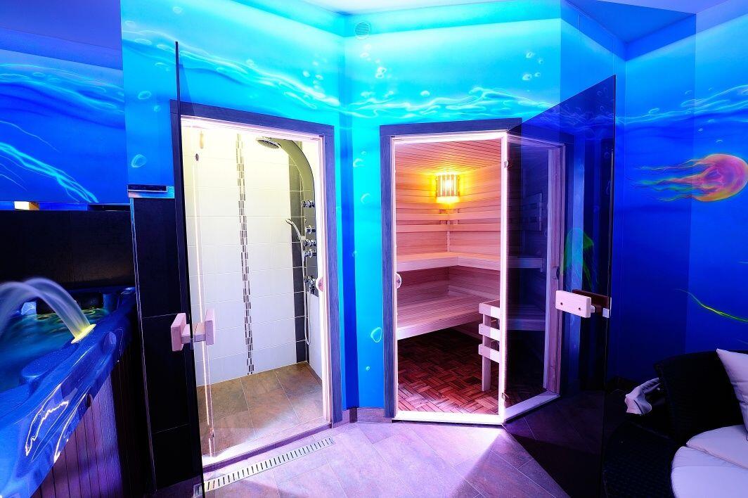 Privátní zóna je situován jako podmořský svět, naší snahou bylo navodit velice příjemnou a uklidňující relaxační atmosféru v privátní vířivce a sauně. Tematická malba celé zóny, je v provedení 3D, podsvícená UV světlem a zaručuje nevšední zážitek.