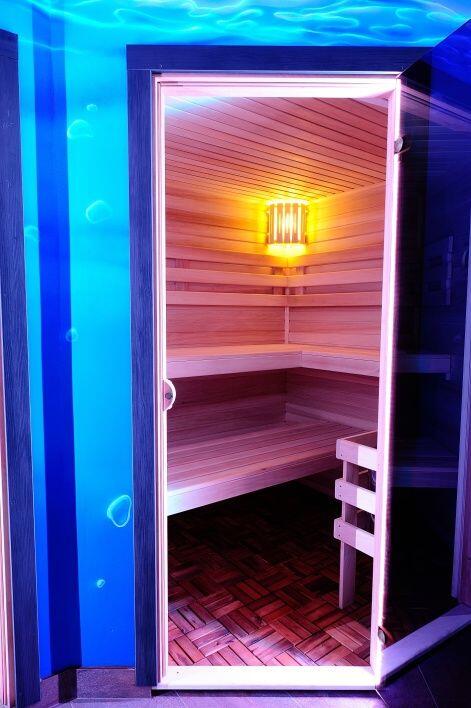 Obsahuje hydromasážní vanu Whirlpool (jakuzy 2,3 x 2,3m), finskou saunu, odpočívací zázemí s lehátky, Smart TV (plný zábavy a relaxační hudby), Wi-Fi free, ochlazovací sprcha, WC, objednávkový tablet + výdejní box (naší prioritou je, aby jste nebyli ničím rušeni při Vaší relaxaci a odpočinku a dodrželi pitný režim..). Samozřejmostí je diskrétnost a hygiena. O intimní osvětlení se stará soustava led světel, které si můžete sami nastavit tak jak je vám příjemné.
