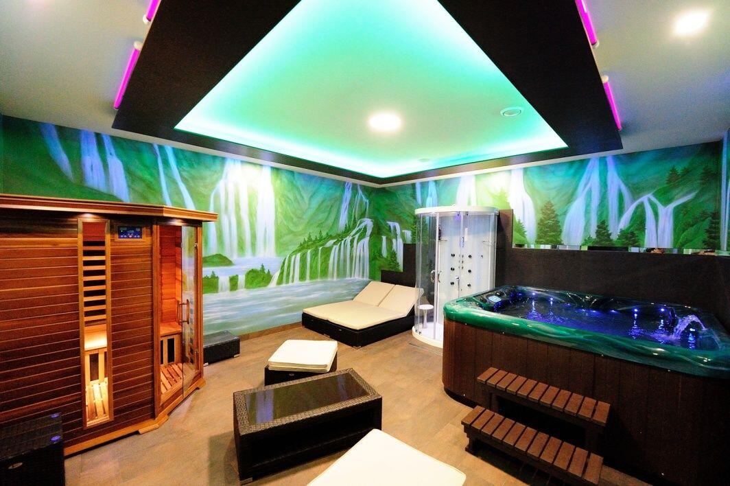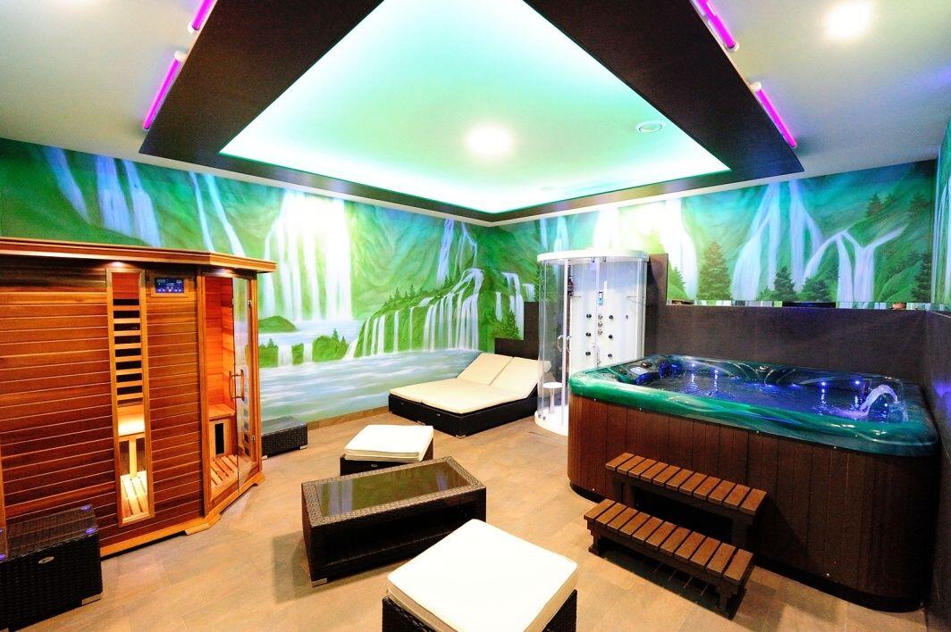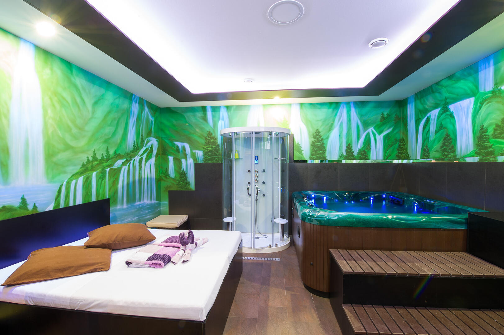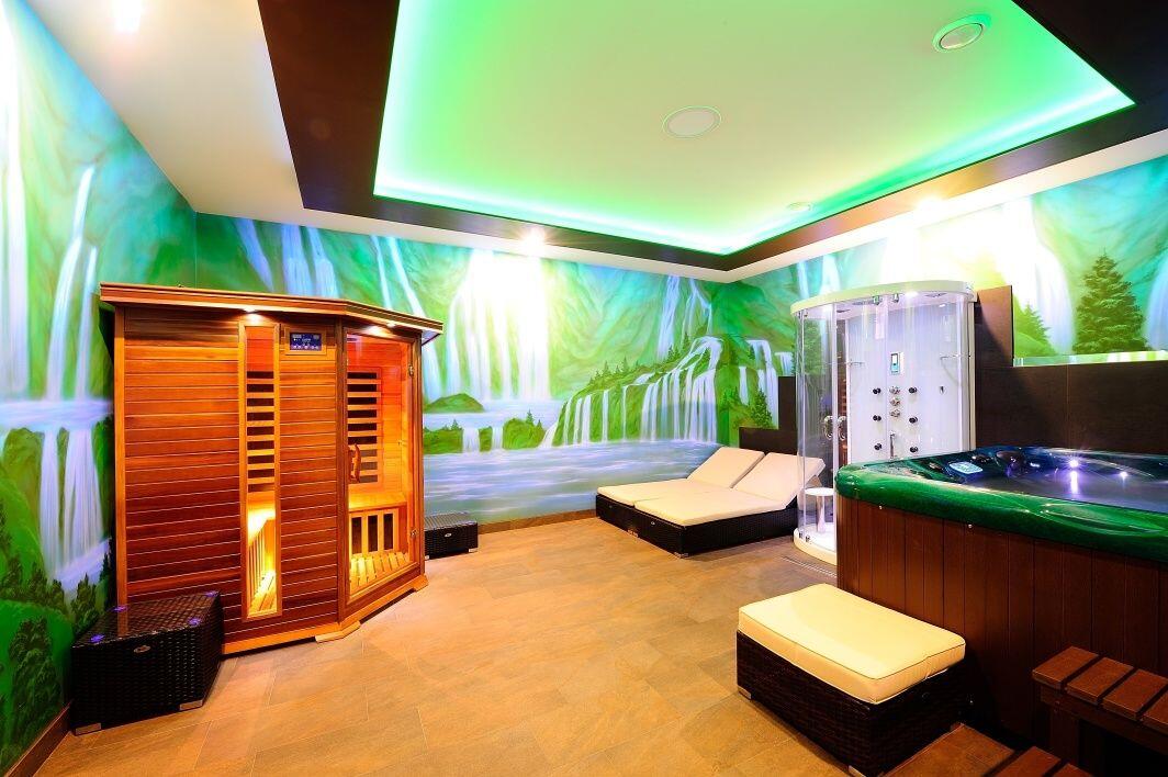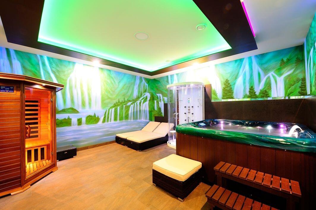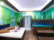 Obsahuje hydromasážní vanu Whirlpool (jakuzy 2,2 x 2,2m), infrasaunu, sprchu, odpočívací zázemí s lehátky, Smart TV (plný zábavy a relaxační hudby), Wi-Fi free, ochlazovací sprcha, WC, objednávkový tablet + výdejní box (naší prioritou je, aby jste nebyli ničím rušeni při Vaší relaxaci a odpočinku a dodrželi pitný režim.) . Samozřejmostí je diskrétnost a hygiena. O intimní osvětlení se stará soustava led světel, které si můžete sami nastavit tak jak je vám příjemné.