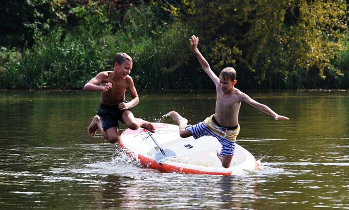 Rodinná půjčovna paddleboardů u břehu Berounky.