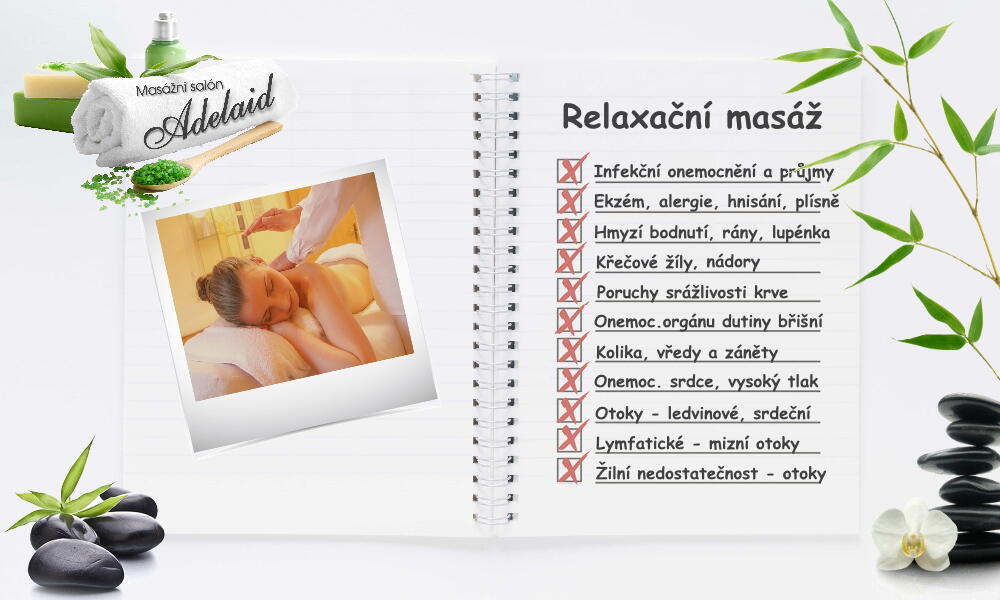 Relaxační masáž harmonizuje a uvolňuje psychické i svalové napětí. Při masáži dosáhnete dokonalého fyzického, psychického a duševního uvolnění, zároveň si odpočinete a vyčistíte hlavu od každodenních starostí.