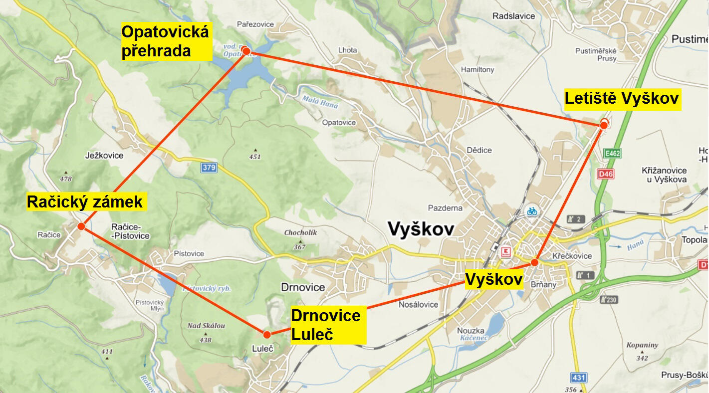Dostavte se prosím 5 - 10 min před plánovaným letem na letiště Vyškov. Místo odletu: Letiště Vyškov, Umístění hangáru na letišti: viz galerie aktivity Dopravní dostupnost: • 35km z Brna, to je cca 25 min osobním automobilem. • U letiště je parkování zdarma. • Vlakové spojení - vlakové nádraží Vyškov. • Autobusové spojení - autobusové nádraží Vyškov. • Autobusové spojení - autobusová zastávka Pustiměř (cca0,5km od letiště). • Autobusové spojení - autobusová zastávka Vojenské a letecké muzeum Vyškov (cca 0,1km od letiště).