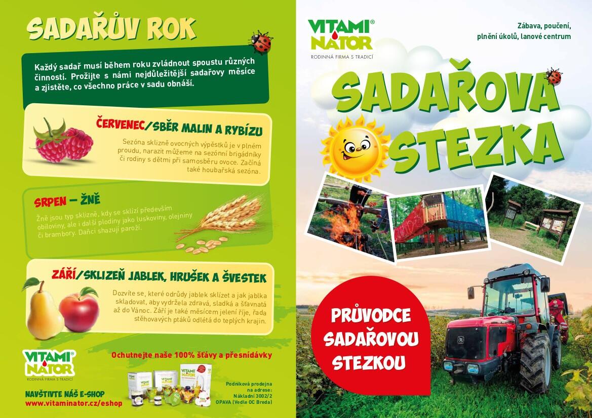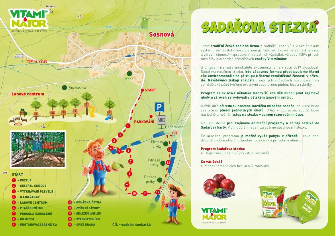 S ohledem na naše mnohaleté zkušenosti jsme v roce 2019 vybudovali Sadařovu naučnou stezku, kde zábavnou formou představujeme hlavní cíle environmentálního přístupu k šetrné zemědělské činnosti v přírodě. Návštěvníci získají znalosti o šetrných způsobech hospodaření na zemědělské půdě tvořené ovocnými sady, ornou půdou, lesy a rybníky. Tyto organizované stezky pořádáme v průběhu školního roku, kdy nás navštěvují hlavně školky a školy z Moravskoslezského kraje.