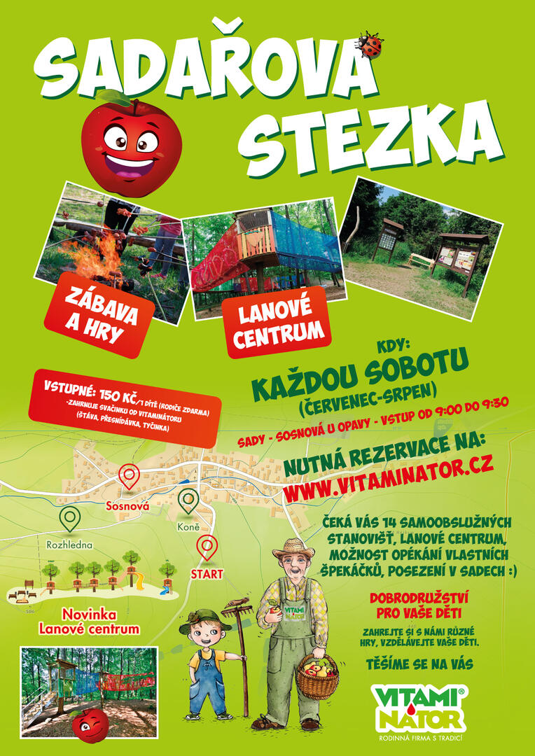 Přijeďte si užít naší Sadařovu stezku, která se uskuteční za příznivého počasí každou sobotu. Děti se zabaví na samoobslužných stanovištích, vydovádí se v dětském lanovém centru, prožijí den v sadech v Sosnové.
