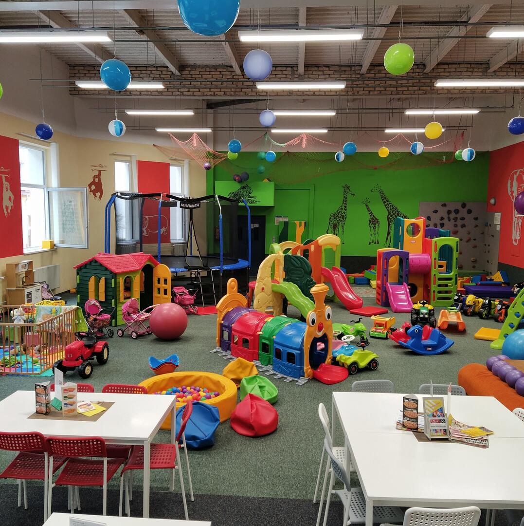 V herně najdete trampolínou, boulderingovou stěnou, terapeutický bazén plný míčků se skluzavkou, molitanovou stavebnici, průlezky, odrážedla, motorky, traktůrek, domeček, kuchyňku, kočárky, panenky, autíčka a stolní hry.