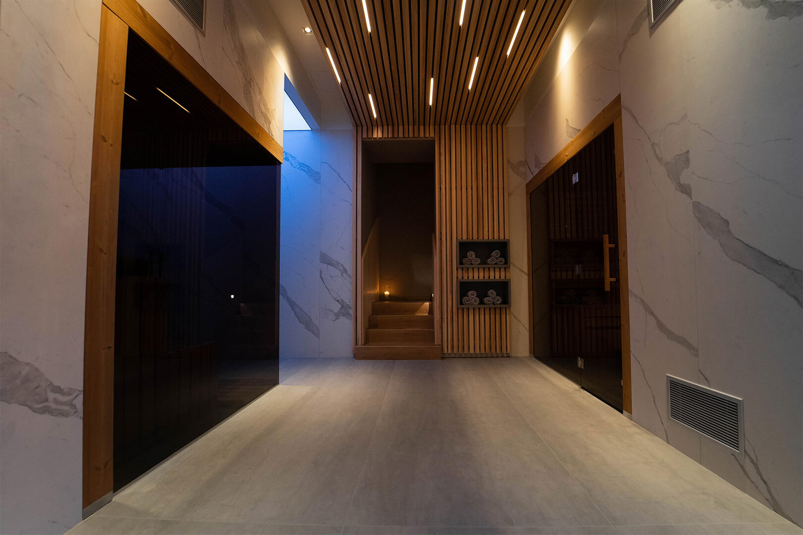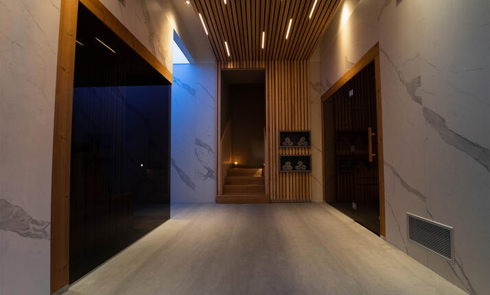 Vybrat si můžete mezi finskou, parní, nebo bylinnou aroma saunou. Pro ochlazení je k dispozici prostorný ochlazovací bazének, případně pak sprchy vizuálně oddělené od společného prostoru pro pocit maximální intimity a diskrétnosti.