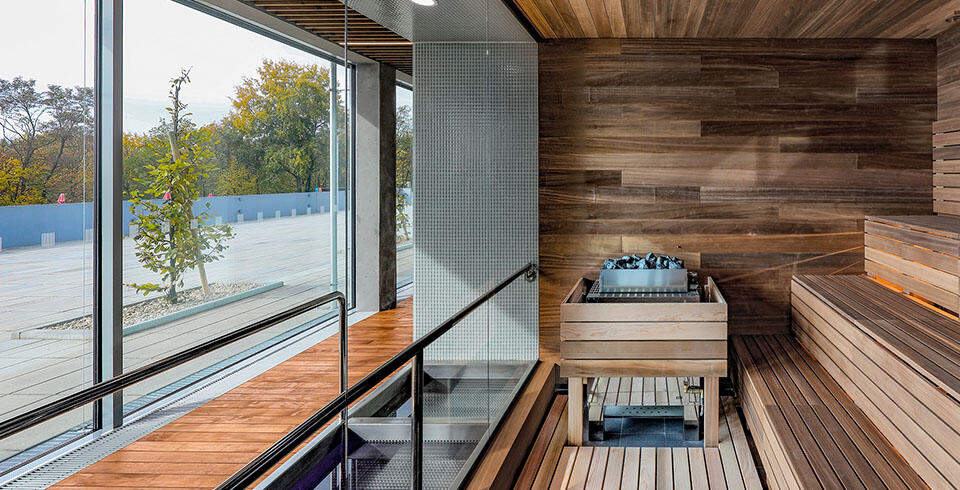Opravdová saunařská "lahůdka" je k dispozici na střešní terase. Dvě zepředu prosklené sauny s výhledem na panoráma Brna.