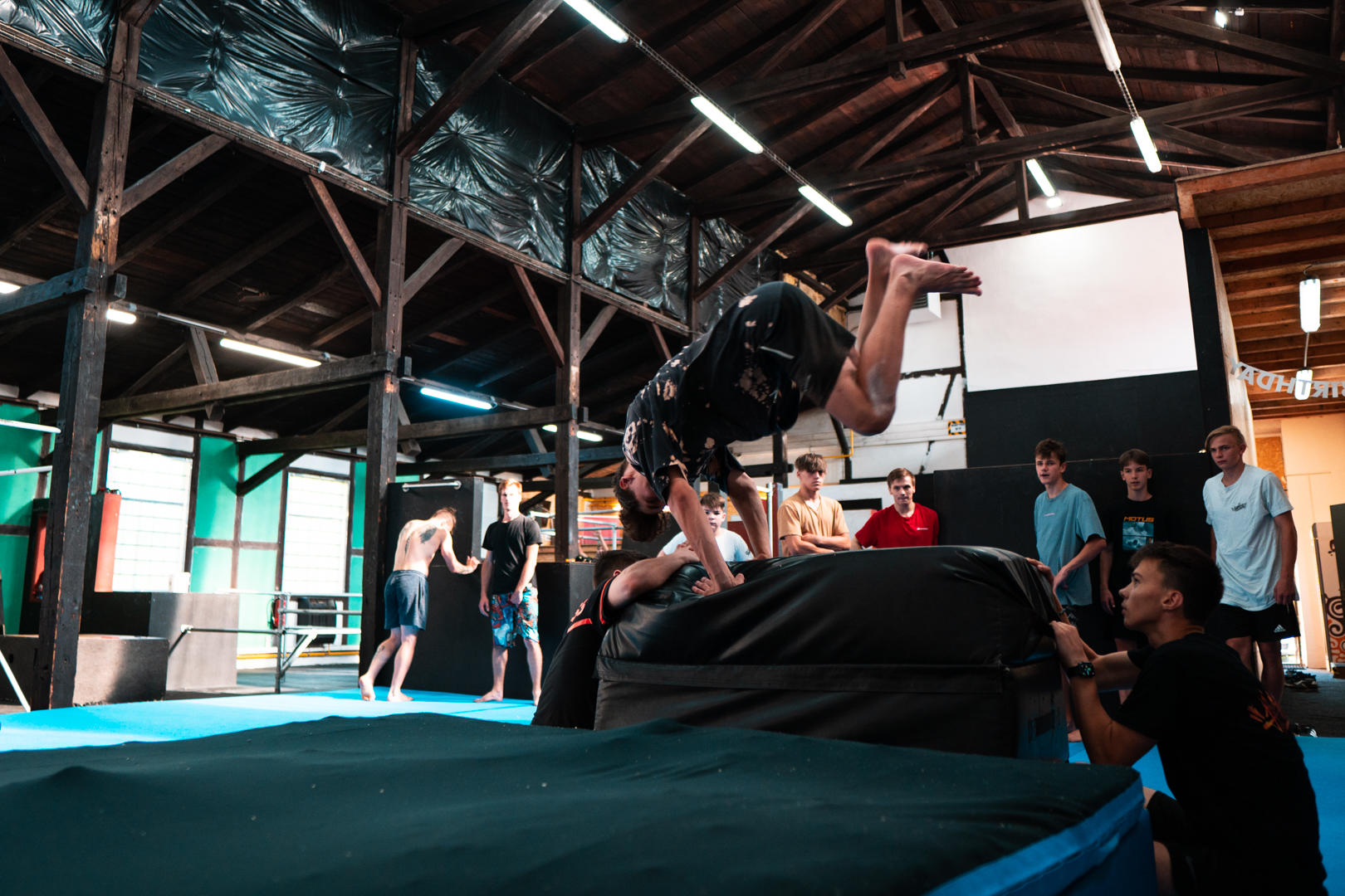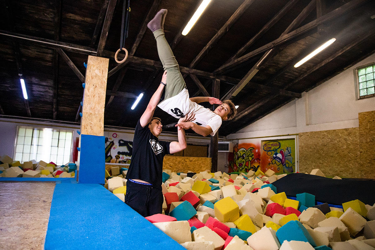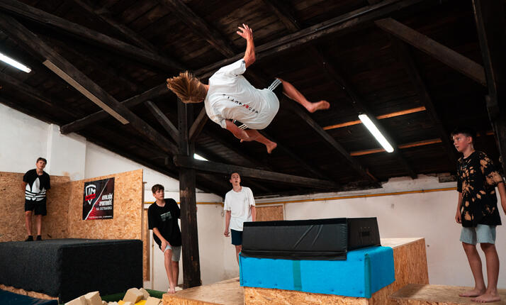 Revoluční sportovní hala zaměřená na parkour a všestranný pohyb. Mimo tradiční parkour překážky pro malé i velké, které tu najdete, patří k vybavení haly také molitanová jáma včetně trampolíny a hrazdy či nafukovací matrace (airtrack). Skutečně širokou škálu možností překonávání překážek a přemisťování se z bodu A do bodu B ti zajistí prostor o rozloze více než 500m². Neváhej a doraž si to vyzkoušet na vlastní kůži sám, ať už s trenérem, nebo bez.