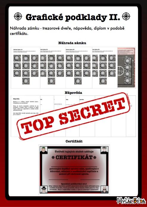 Návod ke hře, pozvánku, podklady pro hru (12 různých šifer a úkolů), nápovědu, pokud by se hráči ocitli v nesnázích, certifikát o úspěšném splnění mise.