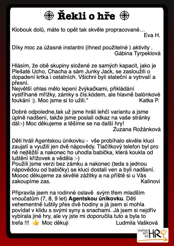Agentská únikovka - escape room převtělí děti do rolí tajných agentů, kteří pátrají po zmizelém agentovi, po kterém zbyla jen složka tajných dokumentů. Hráči listují složkou a snaží se odhalit důležité informace, po kterých zmizelý agent pátral. Mezi tím je kdosi zavře v místnosti, kam je přivedlo pátrání a oni tak musí zjistit kód, aby se mohli dostat ven.