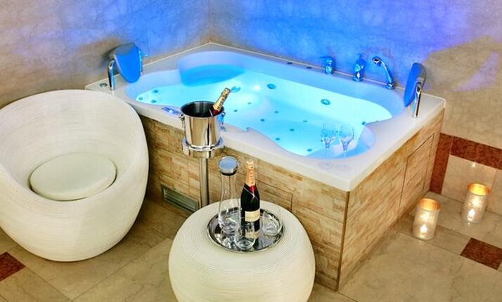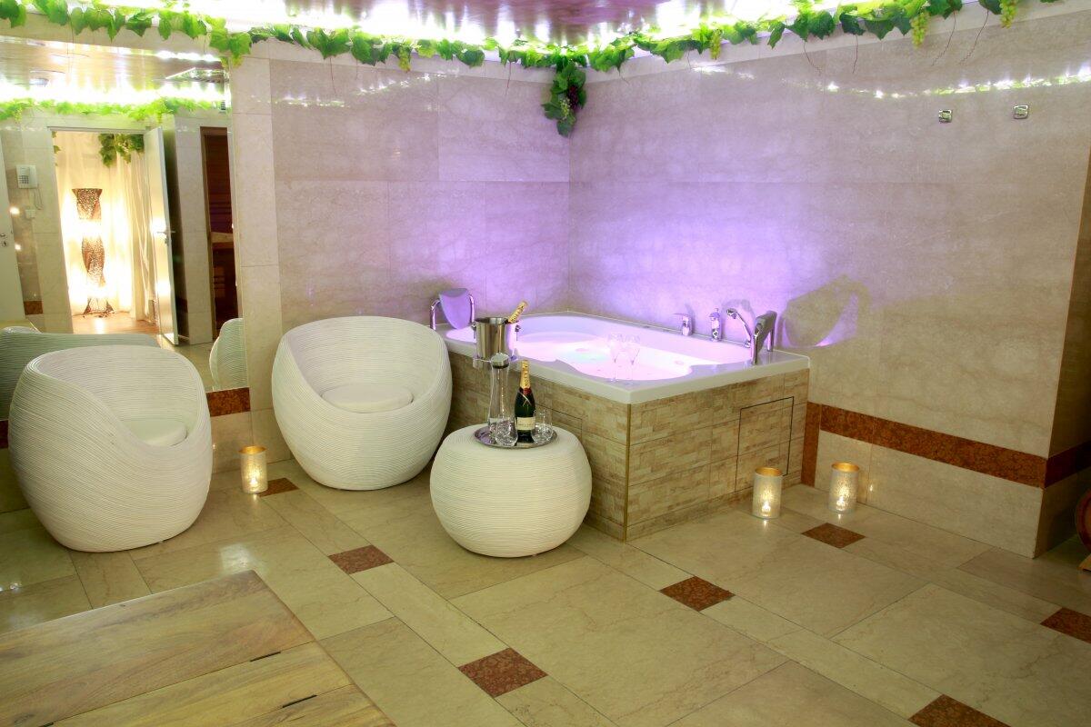 Zde si můžete dopřát účinek vína nejen zevnitř, ale i navenek. Speciální vinná směs spolu s kvalitním vínem dle vašeho výběru v ceně udělají z vaší návštěvy nezapomenutelný zážitek. Vana je naplněná vodou s přidáním redukce z červeného vína, extraktu z vinných hroznů, vonných olejů, vinné soli a vinných jader. Součástí koupele je také neomezené použití finské sauny, která ještě více umocní prožitek z návštěvy a napomůže dosažení kompletní relaxace těla všemi dostupnými způsoby.