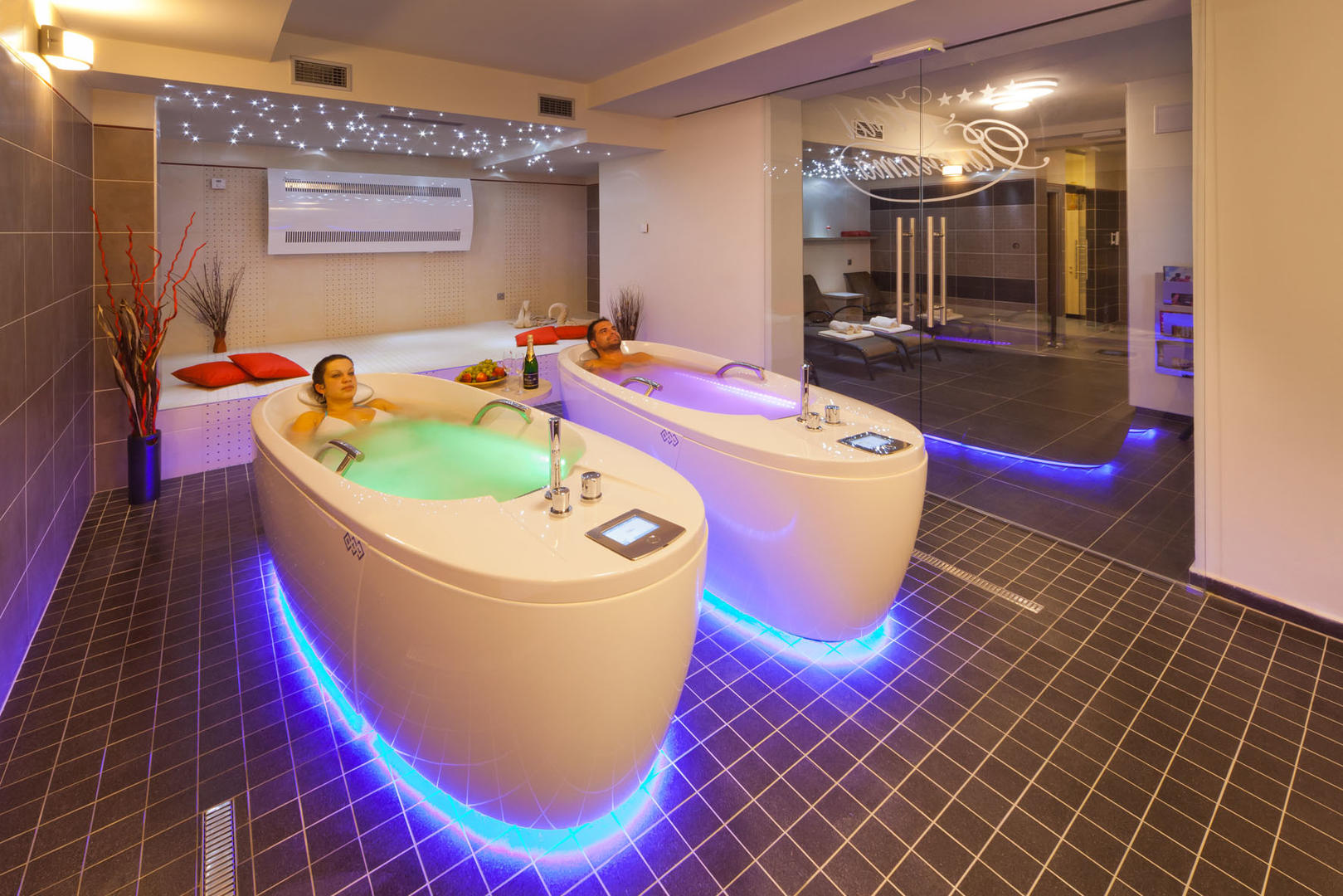 Moderní wellness centrum s relaxačními vanami, saunou, parní kabinou a příjemnými prostory pod speciální hvězdnou oblohou.
