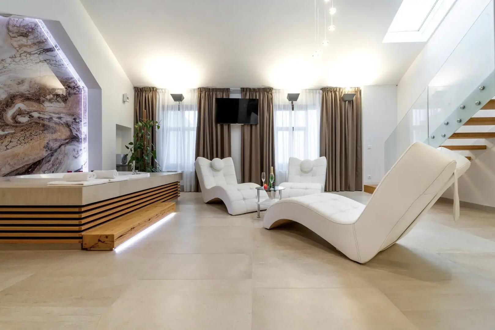 Je největším pokojem, vhodný až pro 10 osob. Pokoj je vybaven luxusní vířivou vanou, finskou saunou pro 8 osob se zážitkovou sprchou. Odpočinout si můžete v relaxační zóně s lehátky a posezením. Mezi standardní vybavení patří i TV, lednička, samostatné WC a prostorná manželská postel. Užijte si ničím nerušenou soukromou relaxaci ve vířivé vaně, finské sauně a nebo si jen poseďte s přáteli u baru.