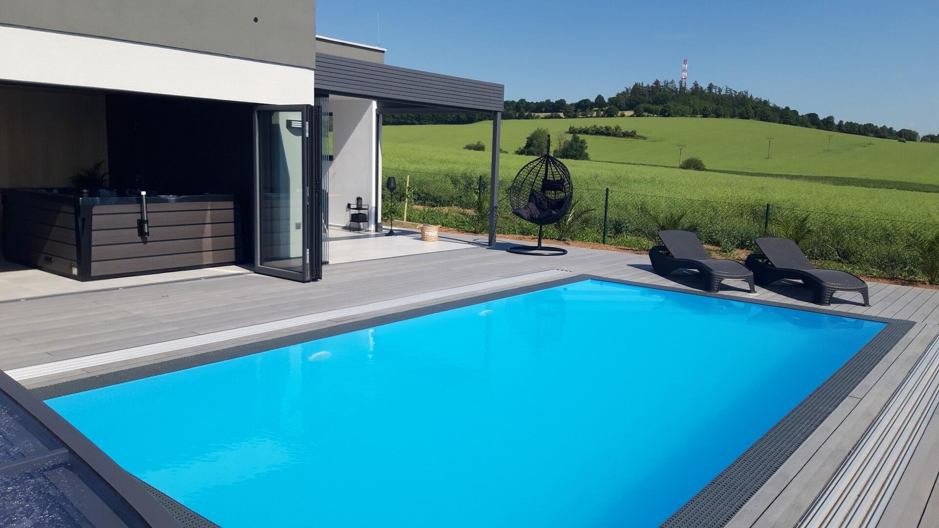 Kromě vnitřní sprchy s vodopátem a masážními tryskami můžete využít ochlazovací káď. Vodu v ochlazovací kádi vypouštíme po každé skupince. Tuto káď najdete na uzavřené venkovní terase, která je dále vybavena 2 relaxačními lehátky.