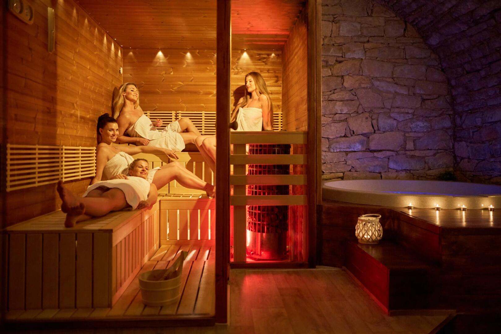 V apartmánu jedna se nachází prostorný moderní whirlpool pro až 8 osob. Whirpool disponuje několika hydromasážními tryskami a volitelným osvětlením. Součástí apartmánu je dále sauna pro 2 osoby, lůžko pro relaxaci, posezení a vinotéka.