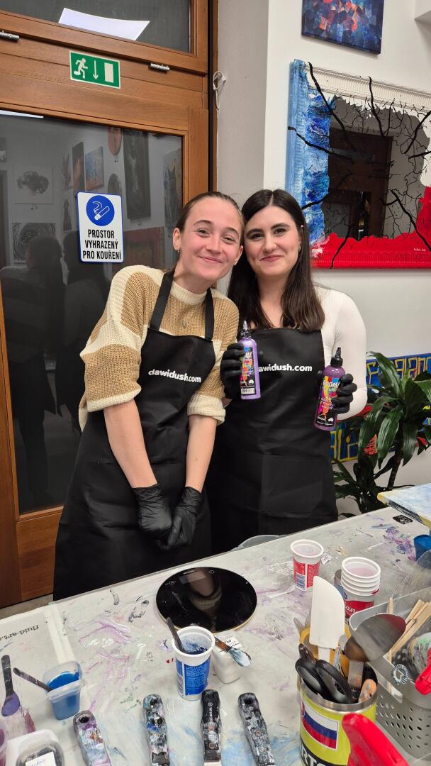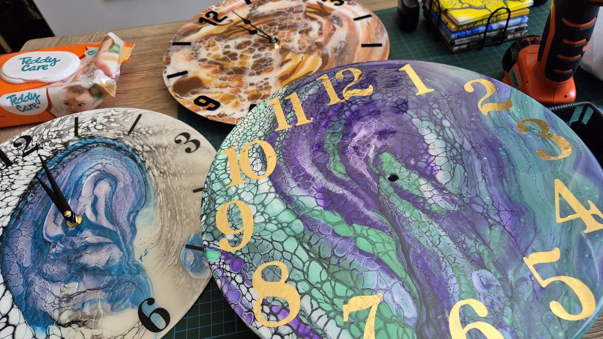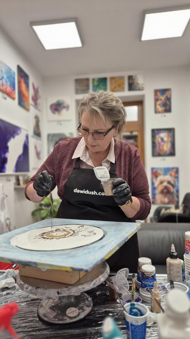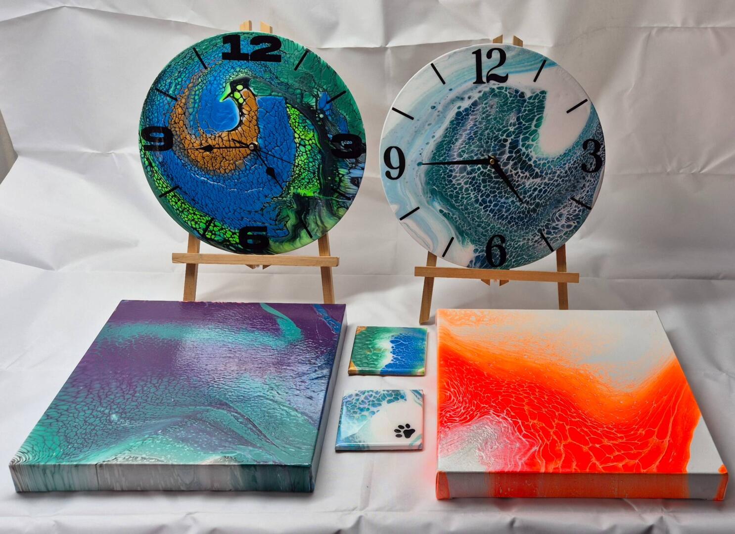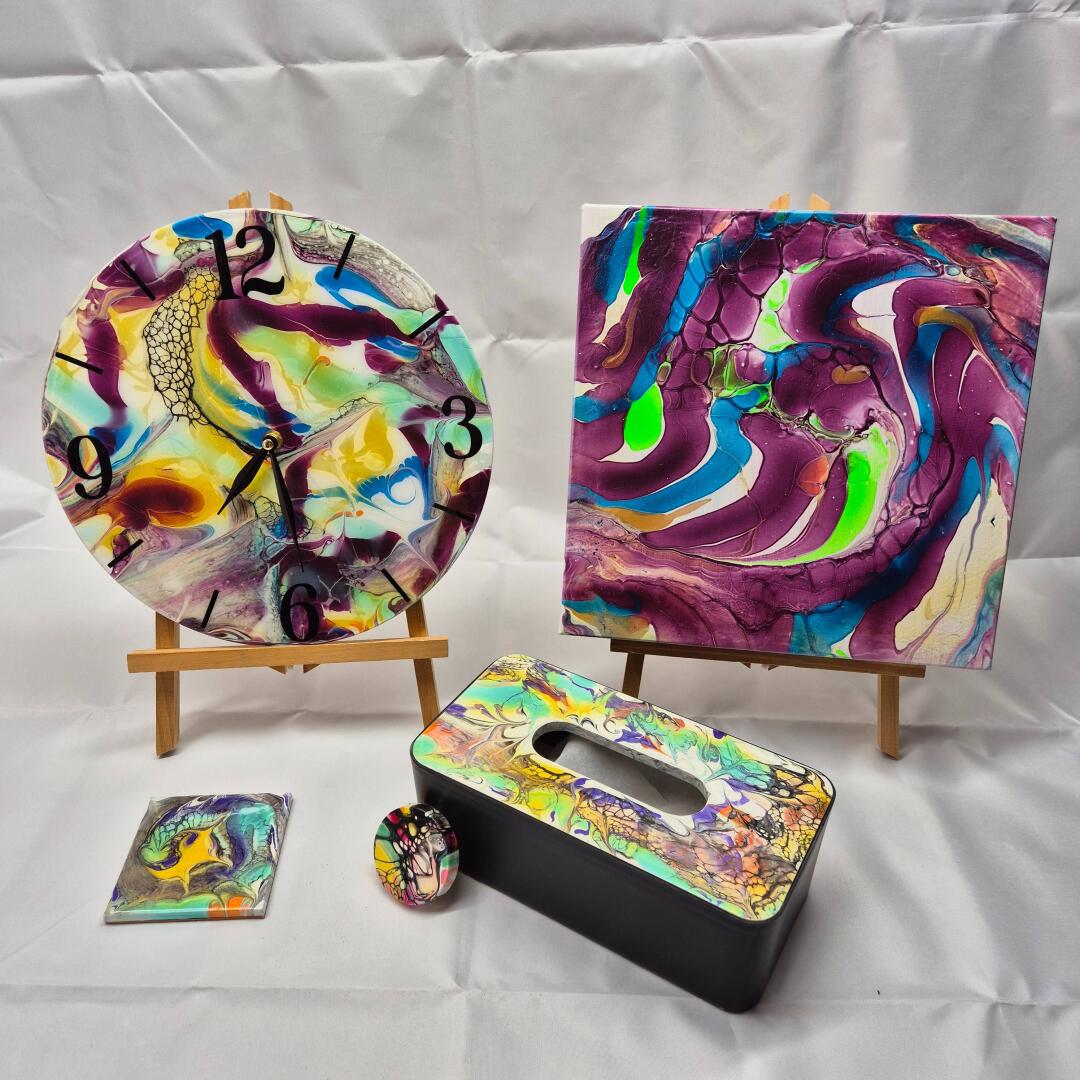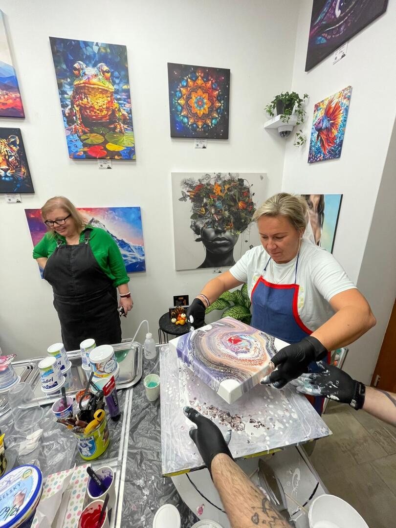 Workshop začíná uvítáním – čeká vás welcome drink, ochranná zástěra a společné seznámení s tím, jak správně míchat a lít akrylové i pigmentové barvy. Pak už se pustíte do vlastního tvoření. Vyberete si, zda chcete malovat keramické podtácky, obraz na plátně nebo vytvořit stylové hodiny ze staré gramofonové desky. A pokud vás láká zkusit všechno, je tu varianta „all in“ – s magnetkou a boxem na kapesníky jako bonusem.