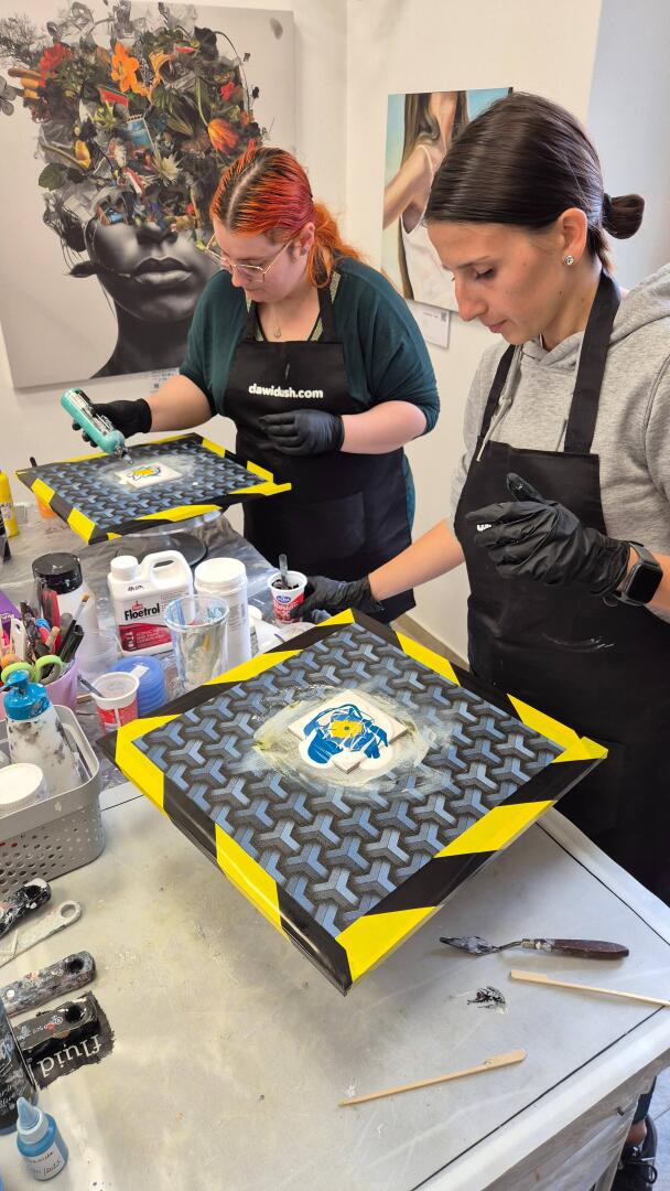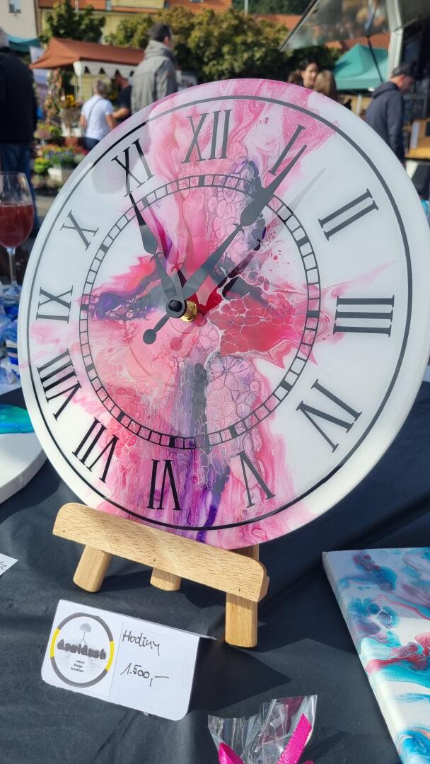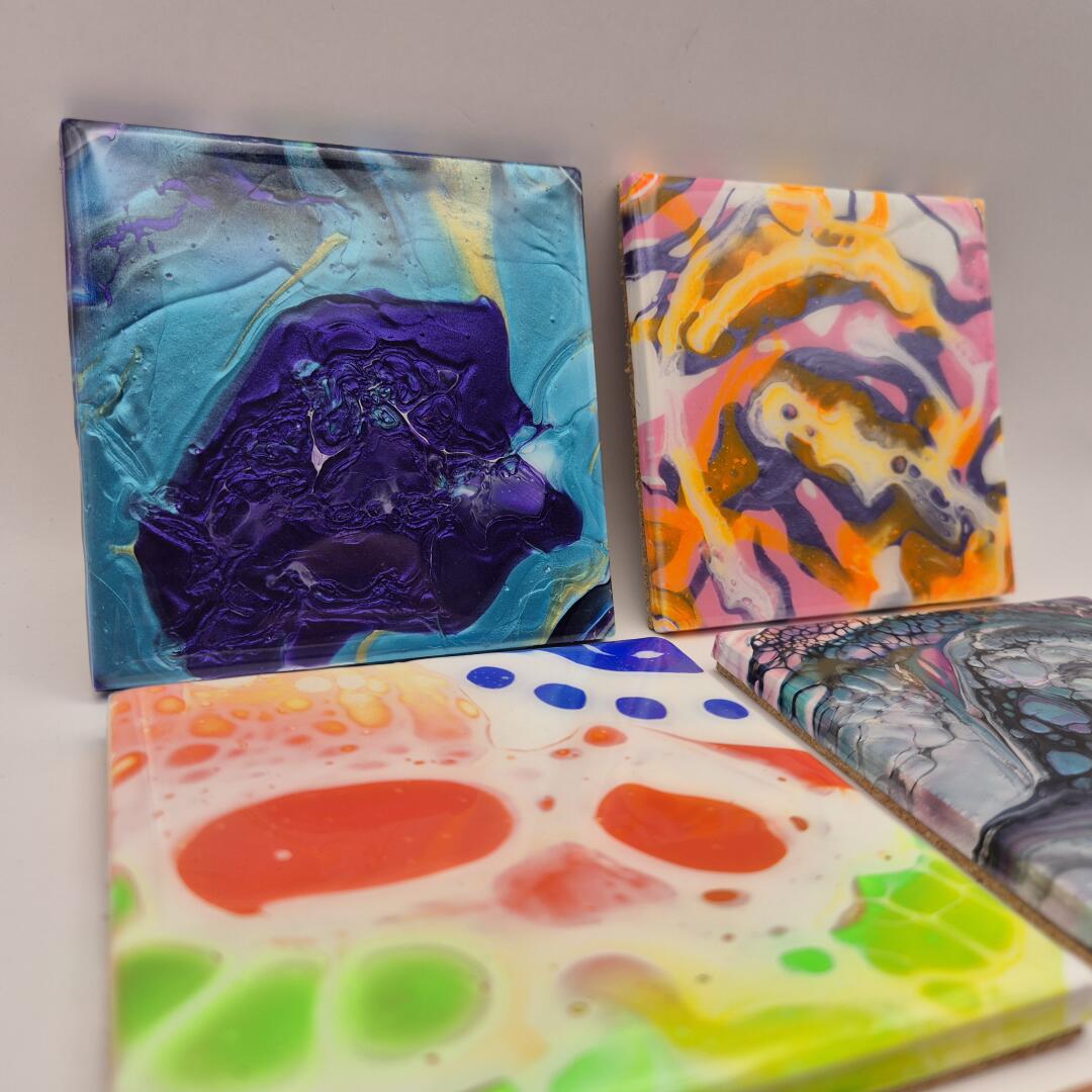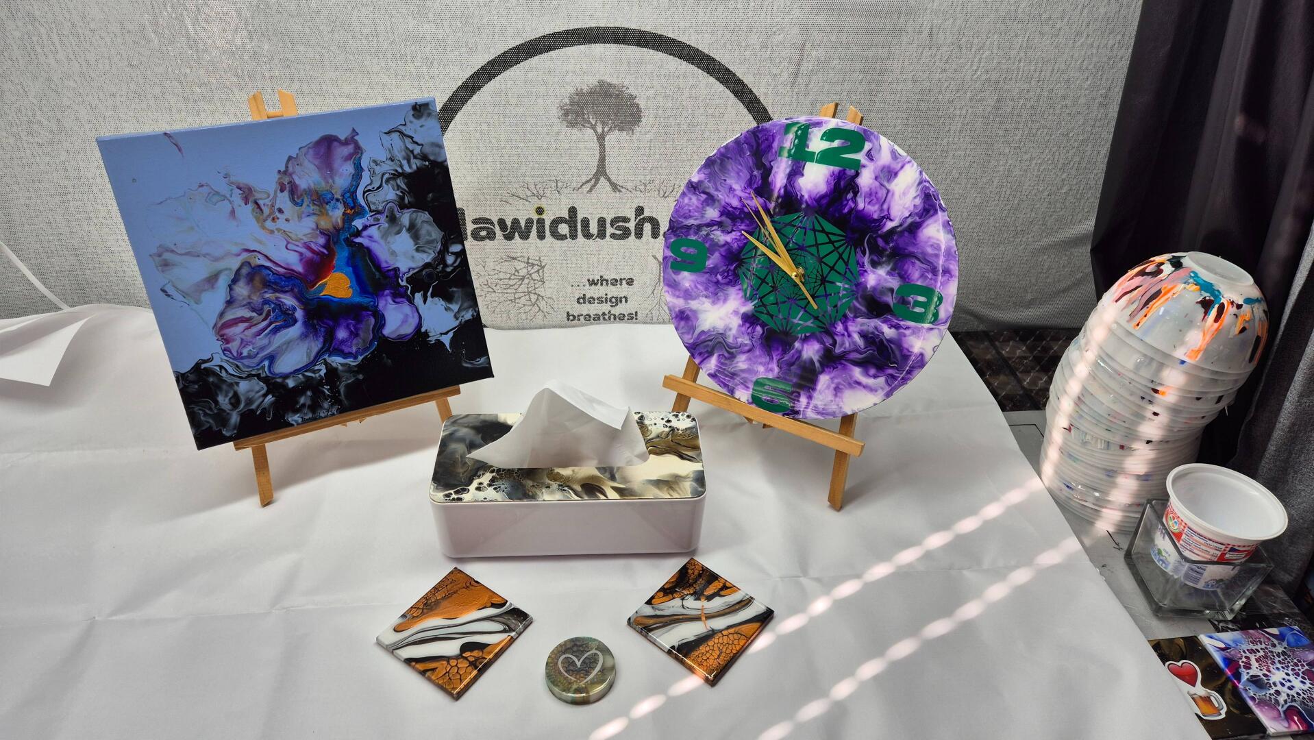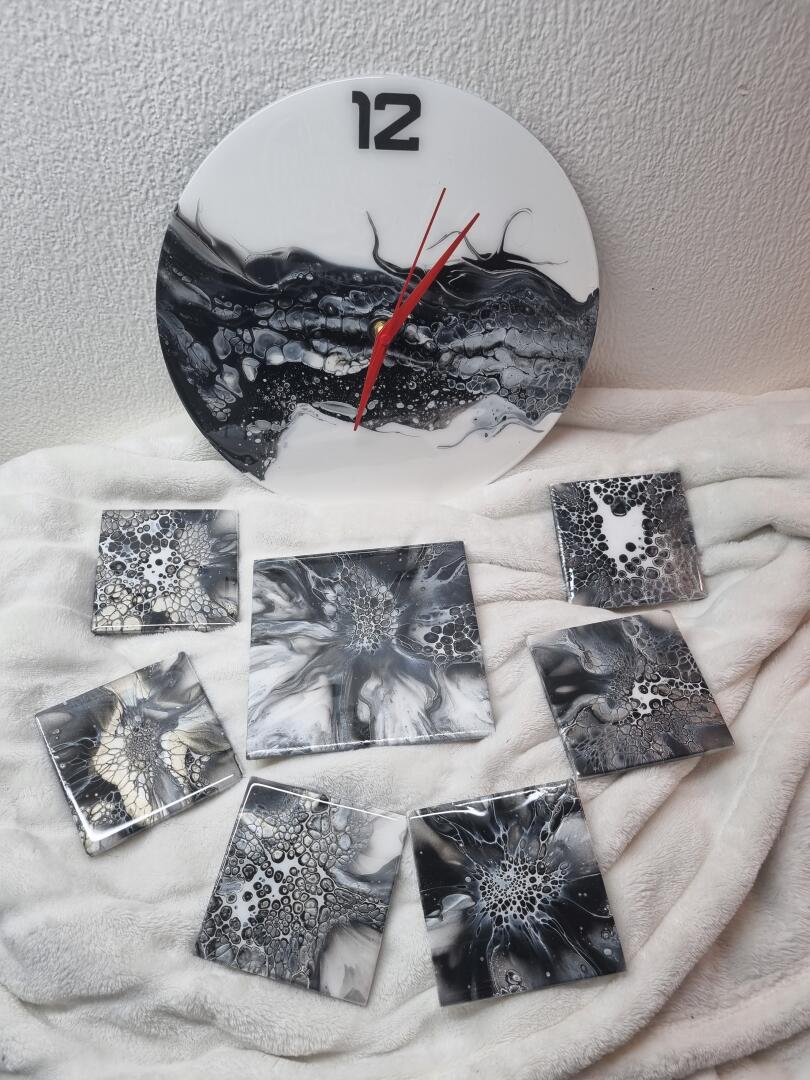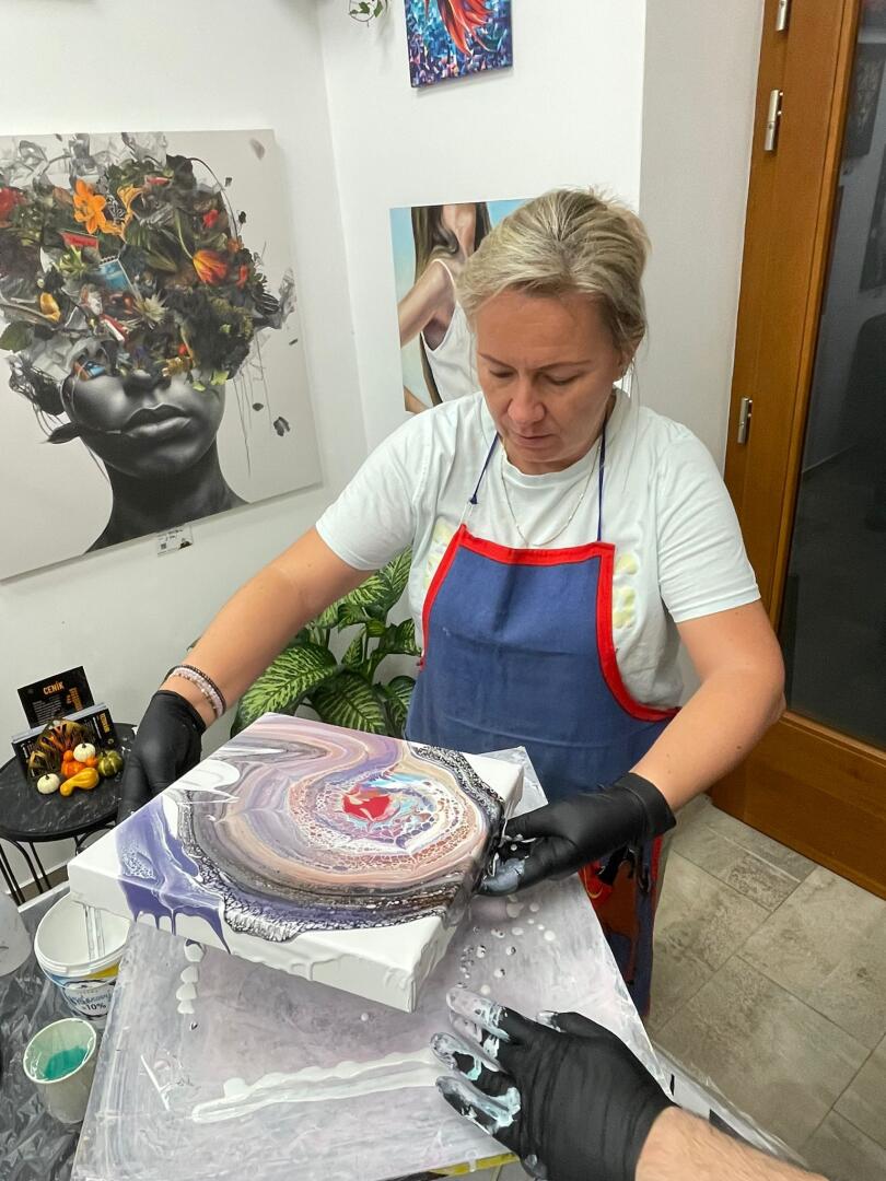 Workshop začíná uvítáním – čeká vás welcome drink, ochranná zástěra a společné seznámení s tím, jak správně míchat a lít akrylové i pigmentové barvy. Pak už se pustíte do vlastního tvoření. Vyberete si, zda chcete malovat keramické podtácky, obraz na plátně nebo vytvořit stylové hodiny ze staré gramofonové desky. A pokud vás láká zkusit všechno, je tu varianta „all in“ – s magnetkou a boxem na kapesníky jako bonusem.