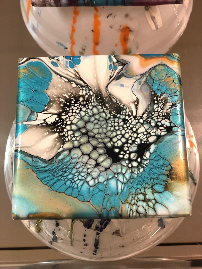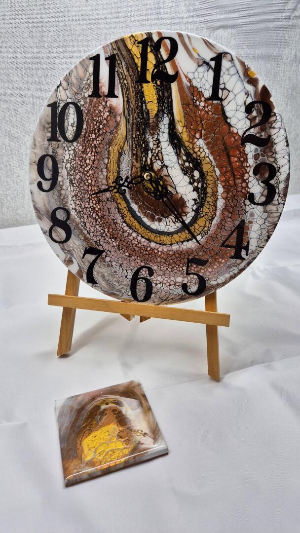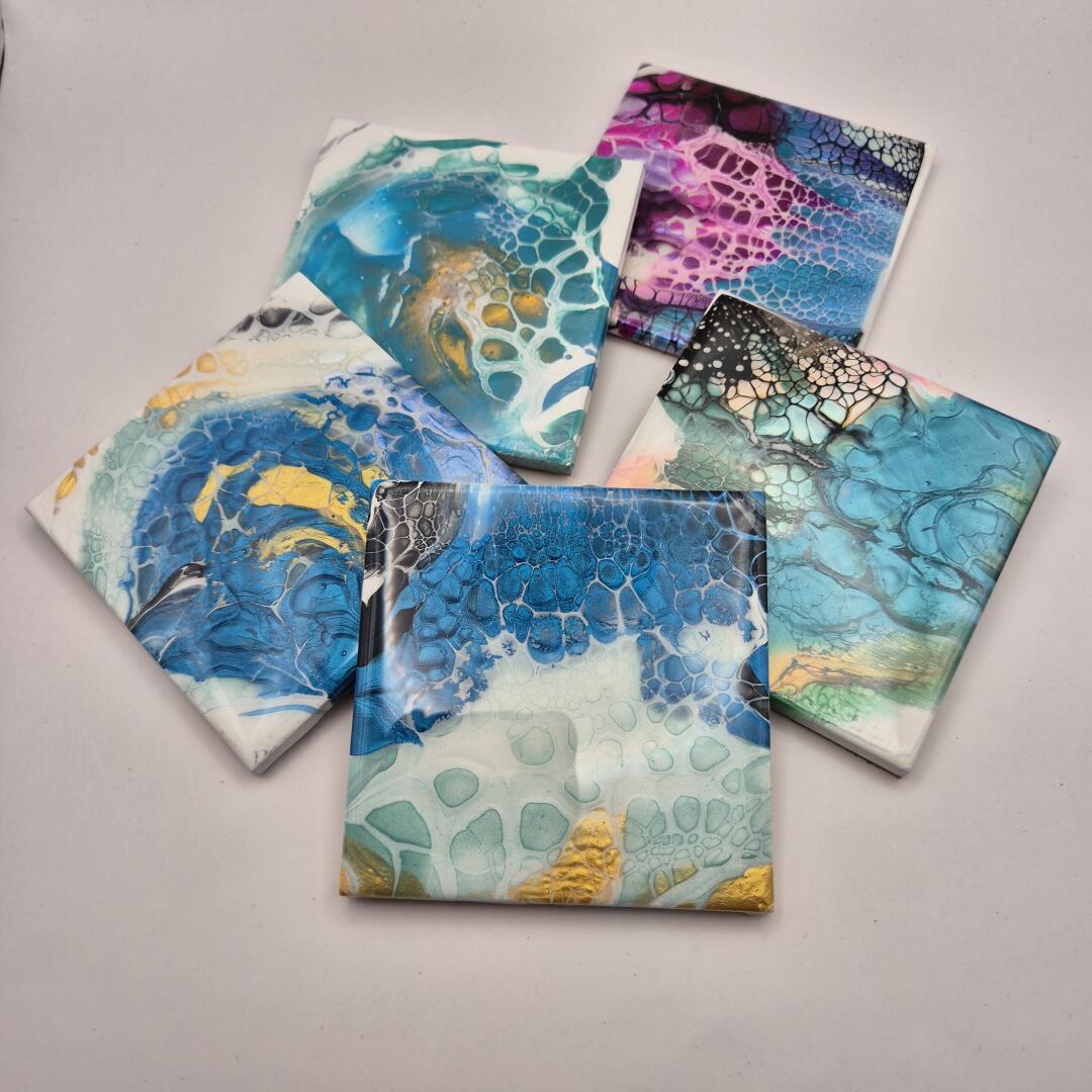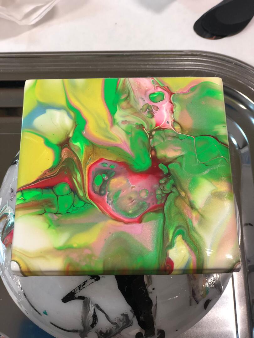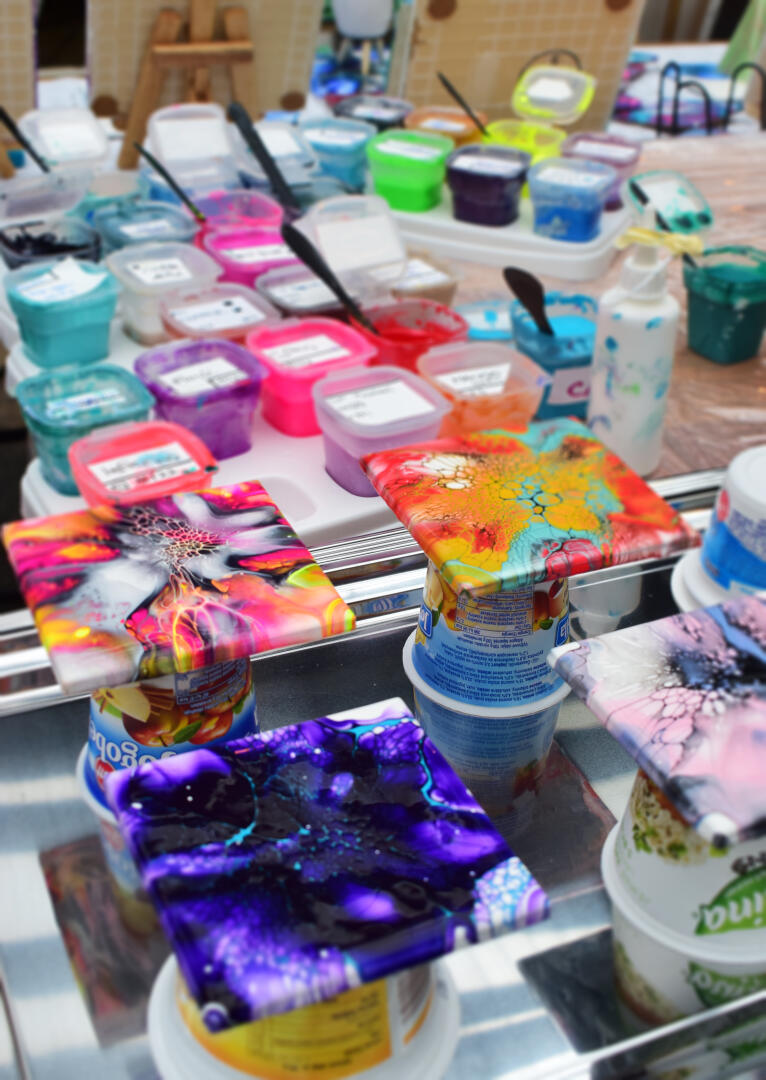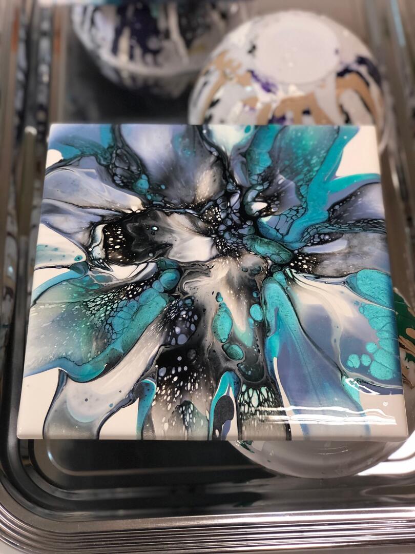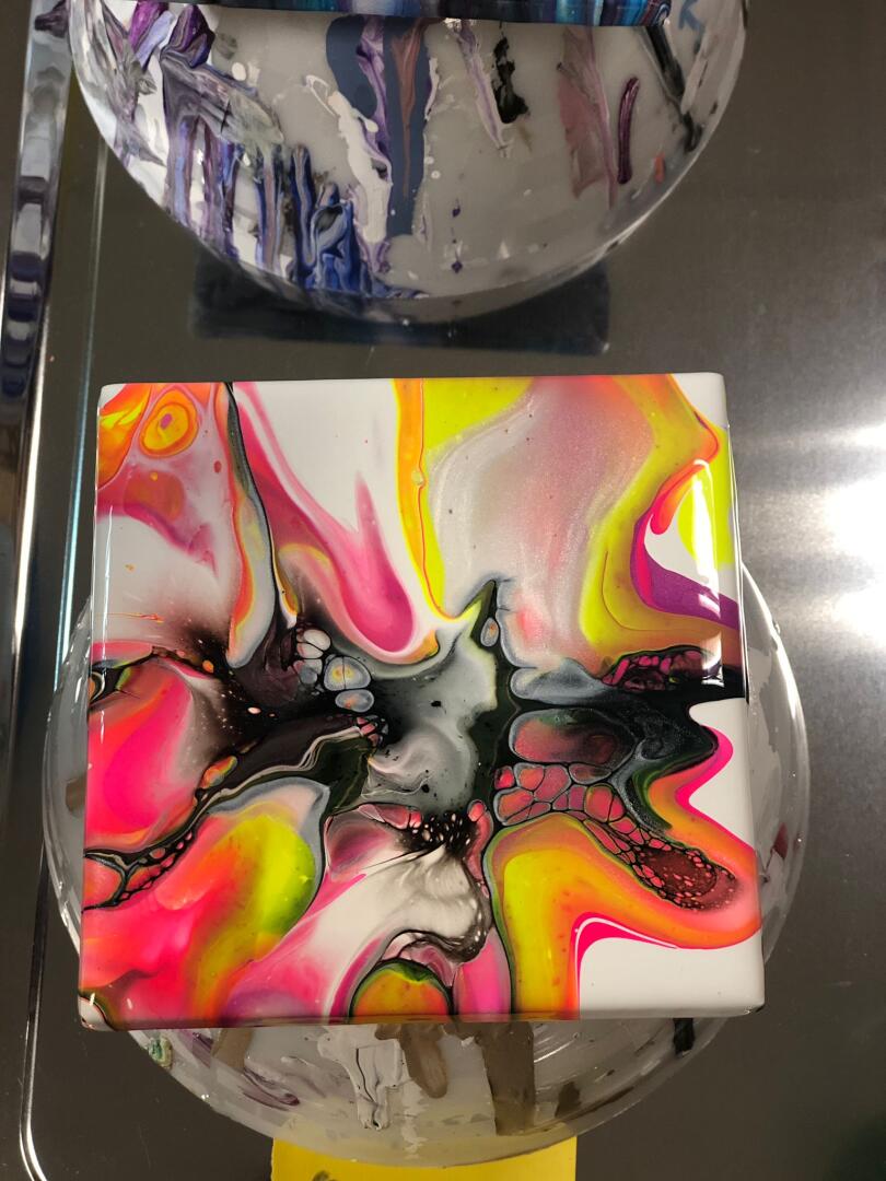 Workshop začíná uvítáním – čeká vás welcome drink, ochranná zástěra a společné seznámení s tím, jak správně míchat a lít akrylové i pigmentové barvy. Pak už se pustíte do vlastního tvoření. Vyberete si, zda chcete malovat keramické podtácky, obraz na plátně nebo vytvořit stylové hodiny ze staré gramofonové desky. A pokud vás láká zkusit všechno, je tu varianta „all in“ – s magnetkou a boxem na kapesníky jako bonusem.